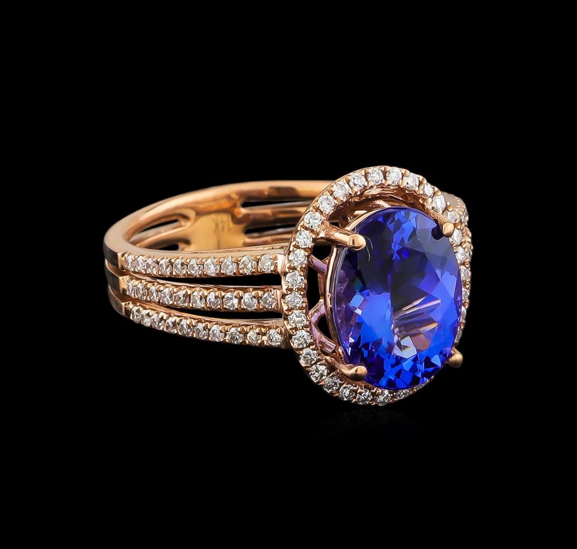 One electronically tested 14KT rose gold ladies combination cast & assembled tanzanite and diamond ring with a split shank with a bright polish finish. Identified with markings of "14K". Condition is new. Containing: One prong set oval modified brilliant cut natural tanzanite, measuring 10.48 x 7.91 x 5.16mm, approximate weight of 2.92ct., clarity is eye clean, type I, medium, moderately strong, violet color, (GIA V 5/4), cut is good. Ninety-Two prong set round brilliant cut diamonds, measuring 1.10 - 1.10 x 0.66mm (depth est.) approximate total weight of 92 Stones = 0.44ct. Clarity: I-1 to I-2. Color: I - J, Cut is Good. Colored gemstones are presumed to have been subjected to commonly used enhancement processes. All diamonds and colored gemstones are graded in the mounting, unless otherwise stated total weight of Colored Stones 2.92ct. Total Weight of Diamonds 0.44ct. Total Weight of Ring 4.80 grams. GGL Appraised.