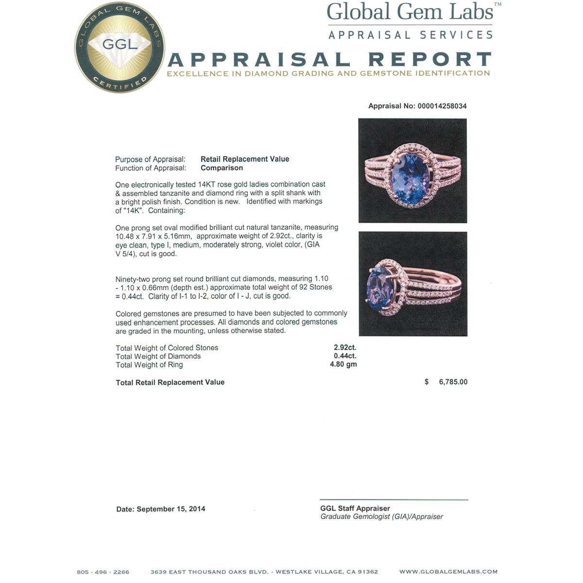 One electronically tested 14KT rose gold ladies combination cast & assembled tanzanite and diamond ring with a split shank with a bright polish finish. Identified with markings of "14K". Condition is new. Containing: One prong set oval modified brilliant cut natural tanzanite, measuring 10.48 x 7.91 x 5.16mm, approximate weight of 2.92ct., clarity is eye clean, type I, medium, moderately strong, violet color, (GIA V 5/4), cut is good. Ninety-Two prong set round brilliant cut diamonds, measuring 1.10 - 1.10 x 0.66mm (depth est.) approximate total weight of 92 Stones = 0.44ct. Clarity: I-1 to I-2. Color: I - J, Cut is Good. Colored gemstones are presumed to have been subjected to commonly used enhancement processes. All diamonds and colored gemstones are graded in the mounting, unless otherwise stated total weight of Colored Stones 2.92ct. Total Weight of Diamonds 0.44ct. Total Weight of Ring 4.80 grams. GGL Appraised at $6,785.00.