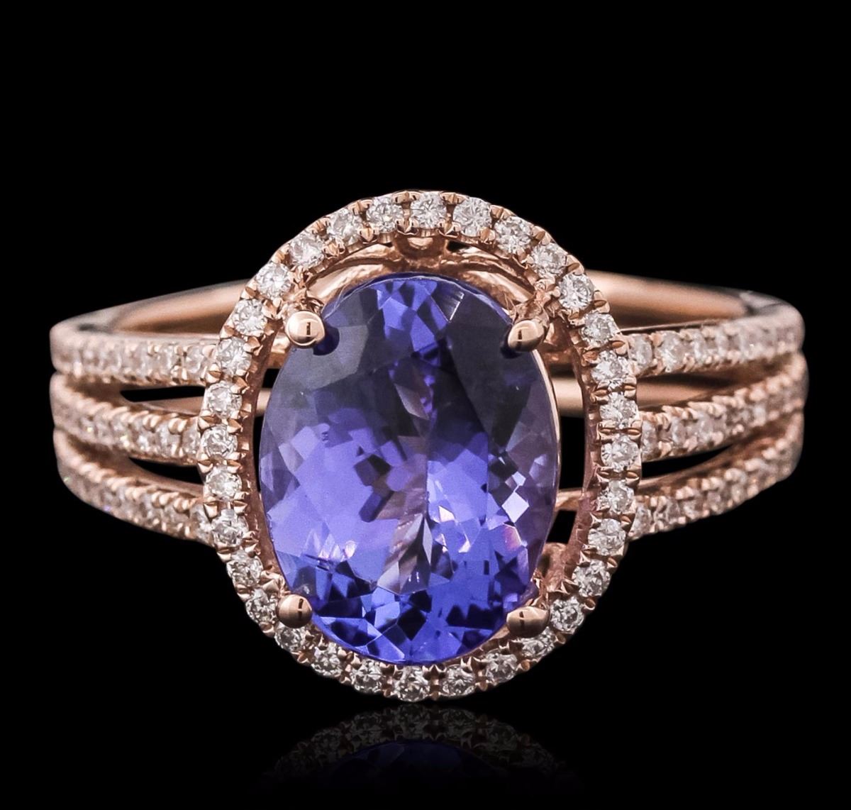 One electronically tested 14KT rose gold ladies combination cast & assembled tanzanite and diamond ring with a split shank with a bright polish finish. Identified with markings of "14K". Condition is new. Containing: One prong set oval modified brilliant cut natural tanzanite, measuring 10.48 x 7.91 x 5.16mm, approximate weight of 2.92ct., clarity is eye clean, type I, medium, moderately strong, violet color, (GIA V 5/4), cut is good. Ninety-Two prong set round brilliant cut diamonds, measuring 1.10 - 1.10 x 0.66mm (depth est.) approximate total weight of 92 Stones = 0.44ct. Clarity: I-1 to I-2. Color: I - J, Cut is Good. Colored gemstones are presumed to have been subjected to commonly used enhancement processes. All diamonds and colored gemstones are graded in the mounting, unless otherwise stated total weight of Colored Stones 2.92ct. Total Weight of Diamonds 0.44ct. Total Weight of Ring 4.80 grams. GGL Appraised at $6,785.00.