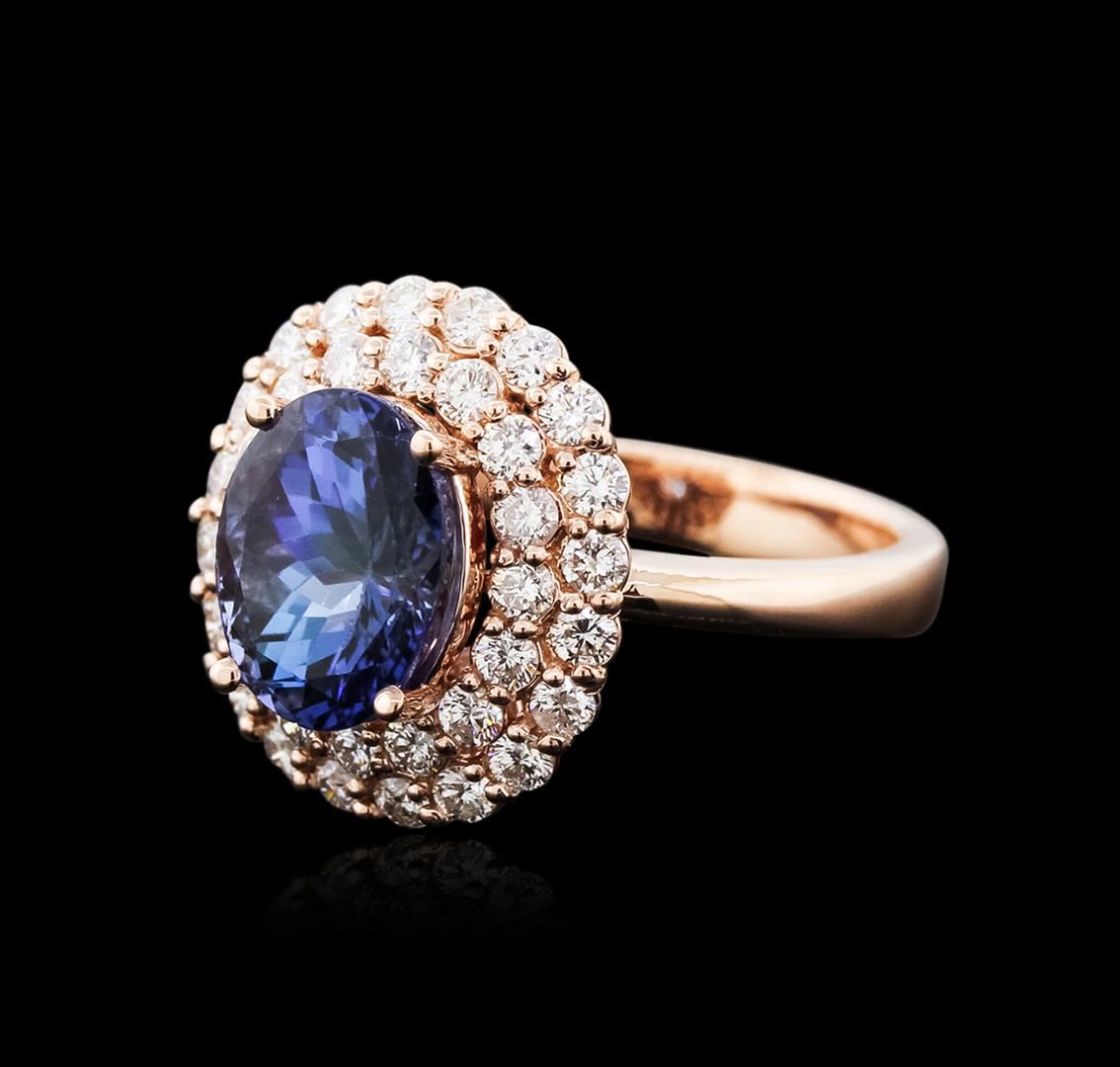 One electronically tested Gold-Rose-14KT ladies cast tanzanite and diamond ring with a bright polish finish. Identified with markings of "14K". Condition is new. Containing: One prong set oval modified brilliant cut natural tanzanite, measuring 10.00. x 8.00. x 5.21mm, approximate weight of 2.93ct., clarity is eye clean, type I, medium light, very slightly grayish, violet color, (GIA V 4/3), cut is good. Thirty-Six prong set round brilliant cut diamonds, measuring 1.80 - 1.80 x 1.08mm (depth est.) approximate total weight of 36 Stones = 0.77ct. Clarity: SI-1 to SI-2. Color: J - K. Colored gemstones are presumed to have been subjected to commonly used enhancement processes. All diamonds and colored gemstones are graded in the mounting, unless otherwise stated. Total Weight of Colored Stones 2.93ct. Total Weight of Diamonds 0.77ct. Total Weight of Ring 6.30 grams. GGL Appraised at $5,090.00.
