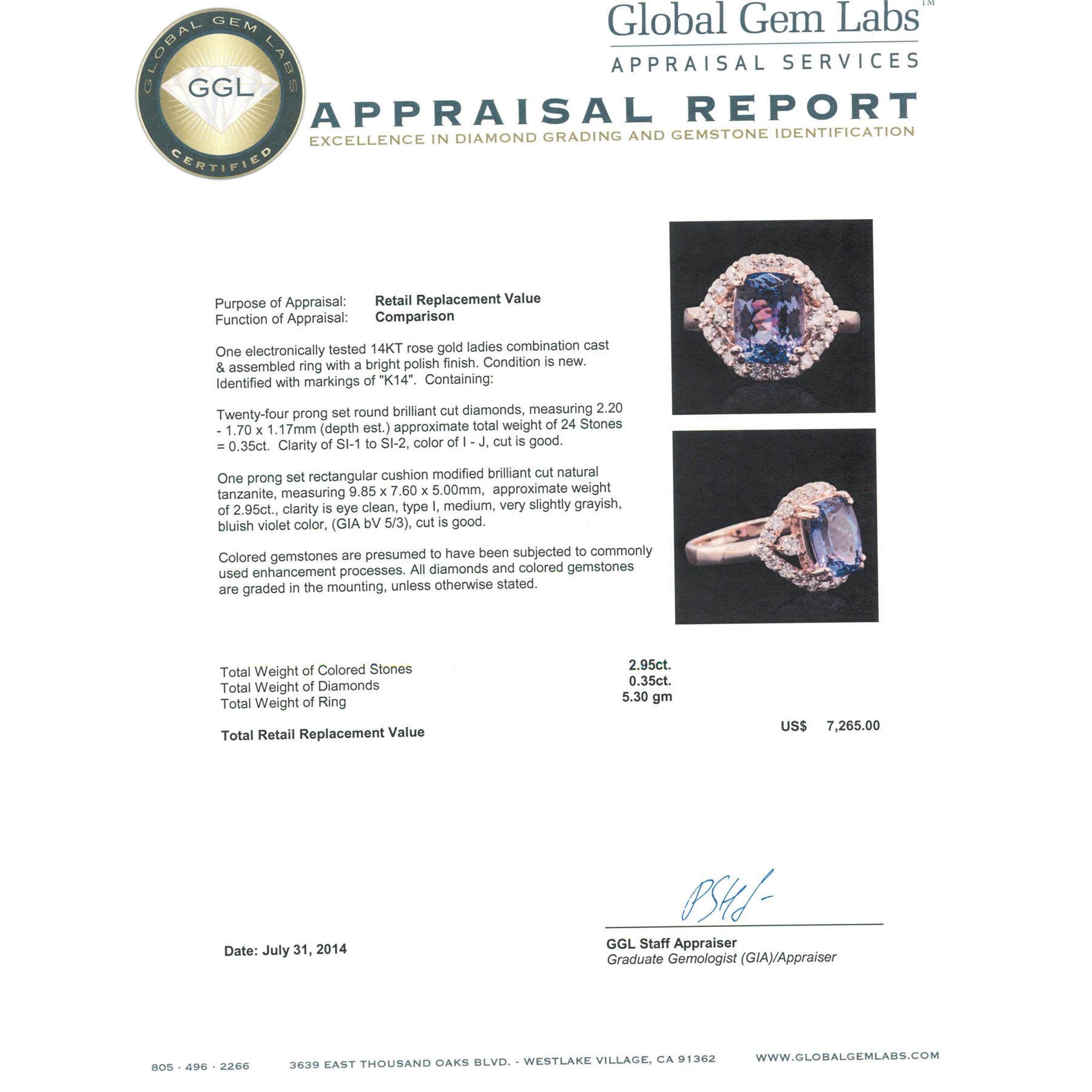 One electronically tested 14KT rose gold ladies combination cast & assembled ring with a bright polish finish. Condition is new. Identified with markings of "K14". Containing: Twenty-Four prong set round brilliant cut diamonds, measuring 2.20 - 1.70 x 1.17mm (depth est.) approximate. Total Weight of 24 Stones = 0.35ct. Clarity: SI-1 to SI-2. Color: I - J, Cut is Good. One prong set rectangular cushion modified brilliant cut natural tanzanite, measuring 9.85 x 7.60 x 5.00mm, approximate weight of 2.95ct., clarity is eye clean, type I, medium, very slightly grayish, bluish violet color, (GIA bV 5/3), cut is good. Colored gemstones are presumed to have been subjected to commonly used enhancement processes. All diamonds and colored gemstones are graded in the mounting, unless otherwise stated. Total Weight of Colored Stones 2.95ct. Total Weight of Diamonds 0.35ct. Total Weight of Ring 5.30 grams. GGL Appraised at $7,265.00.