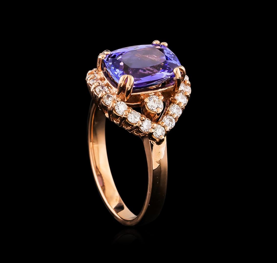 One electronically tested 14KT rose gold ladies combination cast & assembled ring with a bright polish finish. Condition is new. Identified with markings of "K14". Containing: Twenty-Four prong set round brilliant cut diamonds, measuring 2.20 - 1.70 x 1.17mm (depth est.) approximate. Total Weight of 24 Stones = 0.35ct. Clarity: SI-1 to SI-2. Color: I - J, Cut is Good. One prong set rectangular cushion modified brilliant cut natural tanzanite, measuring 9.85 x 7.60 x 5.00mm, approximate weight of 2.95ct., clarity is eye clean, type I, medium, very slightly grayish, bluish violet color, (GIA bV 5/3), cut is good. Colored gemstones are presumed to have been subjected to commonly used enhancement processes. All diamonds and colored gemstones are graded in the mounting, unless otherwise stated. Total Weight of Colored Stones 2.95ct. Total Weight of Diamonds 0.35ct. Total Weight of Ring 5.30 grams. GGL Appraised at $7,265.00.