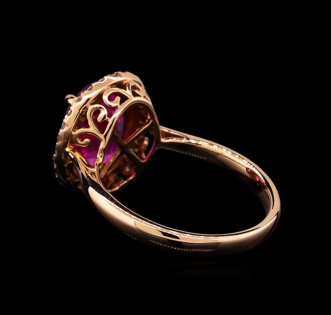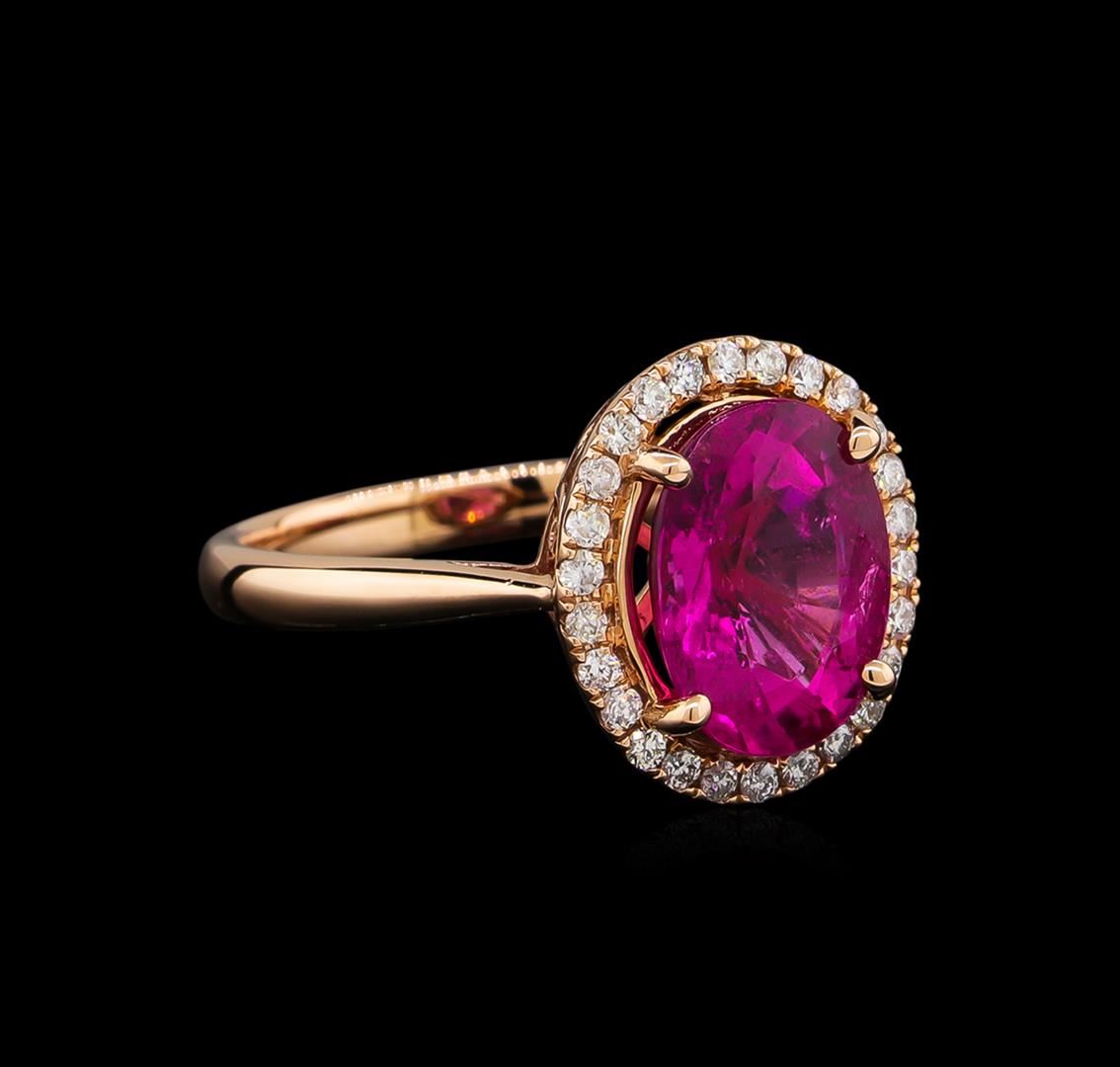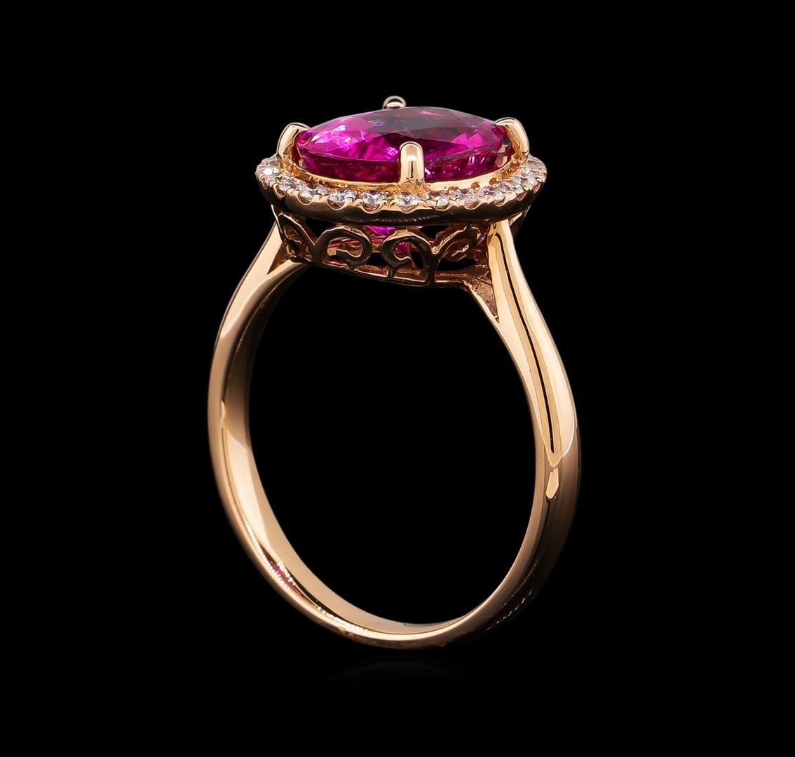 One electronically tested 14KT rose gold ladies cast tourmaline and diamond ring with a bright polish finish. Condition is new, good workmanship. The featured tourmaline is set within a diamond bezel supported by tapering shoulders, completed by a two and one-half millimeter wide band. Identified with markings of "14K". Containing: One prong set oval mixed cut natural pink tourmaline, measuring 10.60 x 8.10 x 5.25mm, 5%. bulge factor, approximate weight of 2.95ct., type II Clarity is moderately included, medium dark, very slightly brownish, purplish pink color, (GIA pPi 6/3), cut is good. Naturally occurring internal & external characteristics are present. Graded in the setting. Twenty-Six prong set round brilliant cut diamonds, measuring 1.50 - 1.40 x 0.87mm (depth est.) approximate. Total Weight of 26 Stones = 0.39ct. Graded in the setting. Clarity: SI-1 to I-1. Color: G - I. Total Weight of Colored Stones 2.95ct. Total Weight of Diamonds 0.39ct. Total Weight of Ring 4.09grams. AIG Appraised at $2,830.00.
