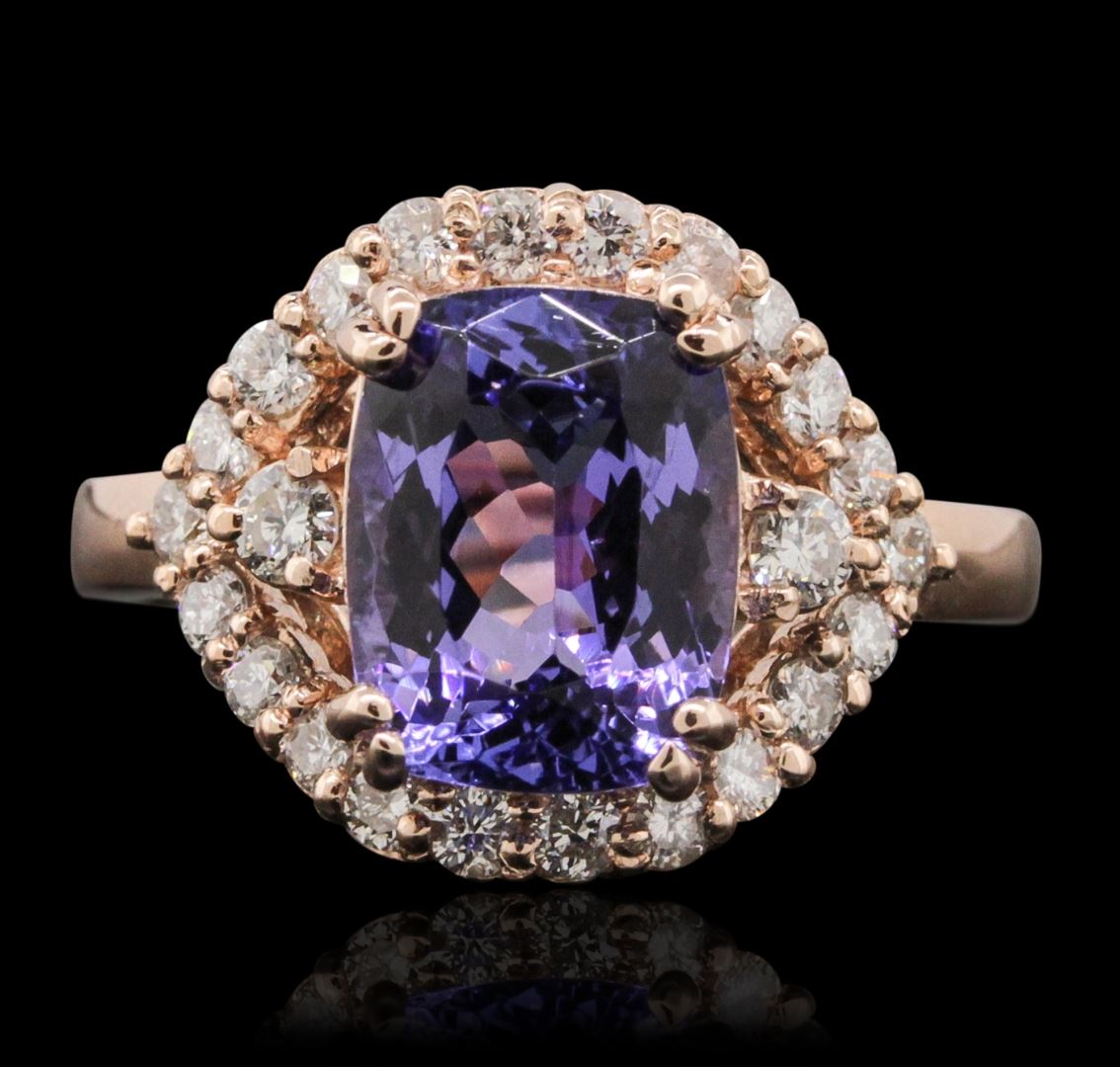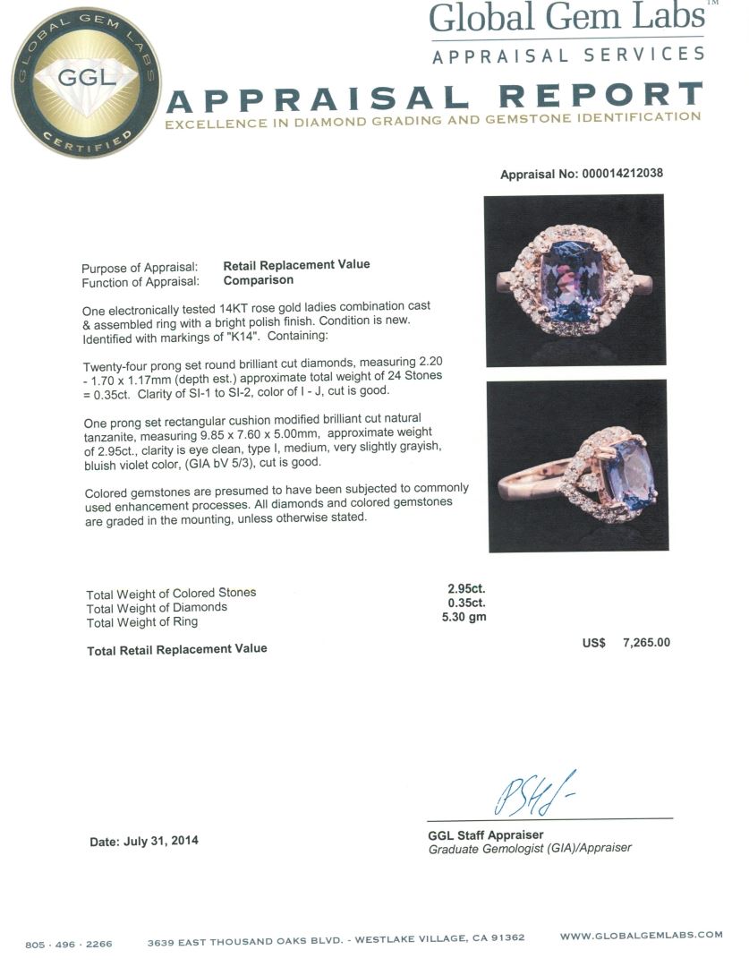 One electronically tested 14KT rose gold ladies combination cast & assembled ring with a bright polish finish. Condition is new. Identified with markings of "K14". Containing: Twenty-Four prong set round brilliant cut diamonds, measuring 2.20 - 1.70 x 1.17mm (depth est.) approximate. Total Weight of 24 Stones = 0.35ct. Clarity: SI-1 to SI-2. Color: I - J, Cut is Good. One prong set rectangular cushion modified brilliant cut natural tanzanite, measuring 9.85 x 7.60 x 5.00mm, approximate weight of 2.95ct., clarity is eye clean, type I, medium, very slightly grayish, bluish violet color, (GIA bV 5/3), cut is good. Colored gemstones are presumed to have been subjected to commonly used enhancement processes. All diamonds and colored gemstones are graded in the mounting, unless otherwise stated. Total Weight of Colored Stones 2.95ct. Total Weight of Diamonds 0.35ct. Total Weight of Ring 5.30 grams. GGL Appraised at $7,265.00.