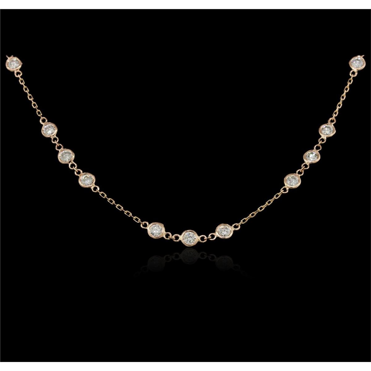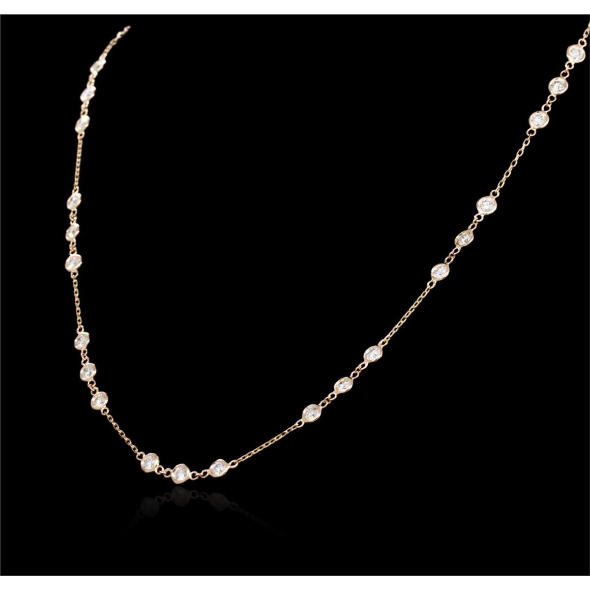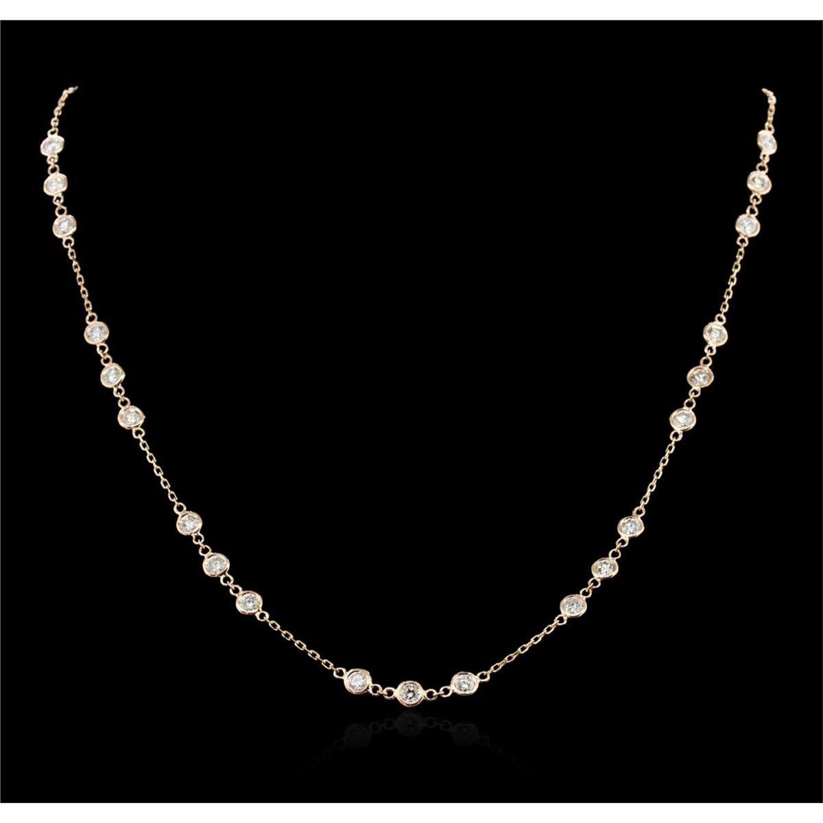 One electronically tested 14KT rose gold ladies cast diamond necklace with a lobster claw clasp with a bright polish finish. Measurements: 16" in length Identified with markings of "K14". Condition is new. Containing: Thirty bezel set round brilliant cut diamonds, measuring 3.00 - 3.00 x 1.80mm (depth est.) approximate total weight of 30 Stones = 2.96ct. Clarity: SI-2 to I-1. Color: J - K, Cut is Good. All diamonds are graded in the mounting, unless otherwise stated. Total Weight of Diamonds 2.96ct. Total Weight of Necklace 5.60 grams. GGL Appraised at $6,250.00.
