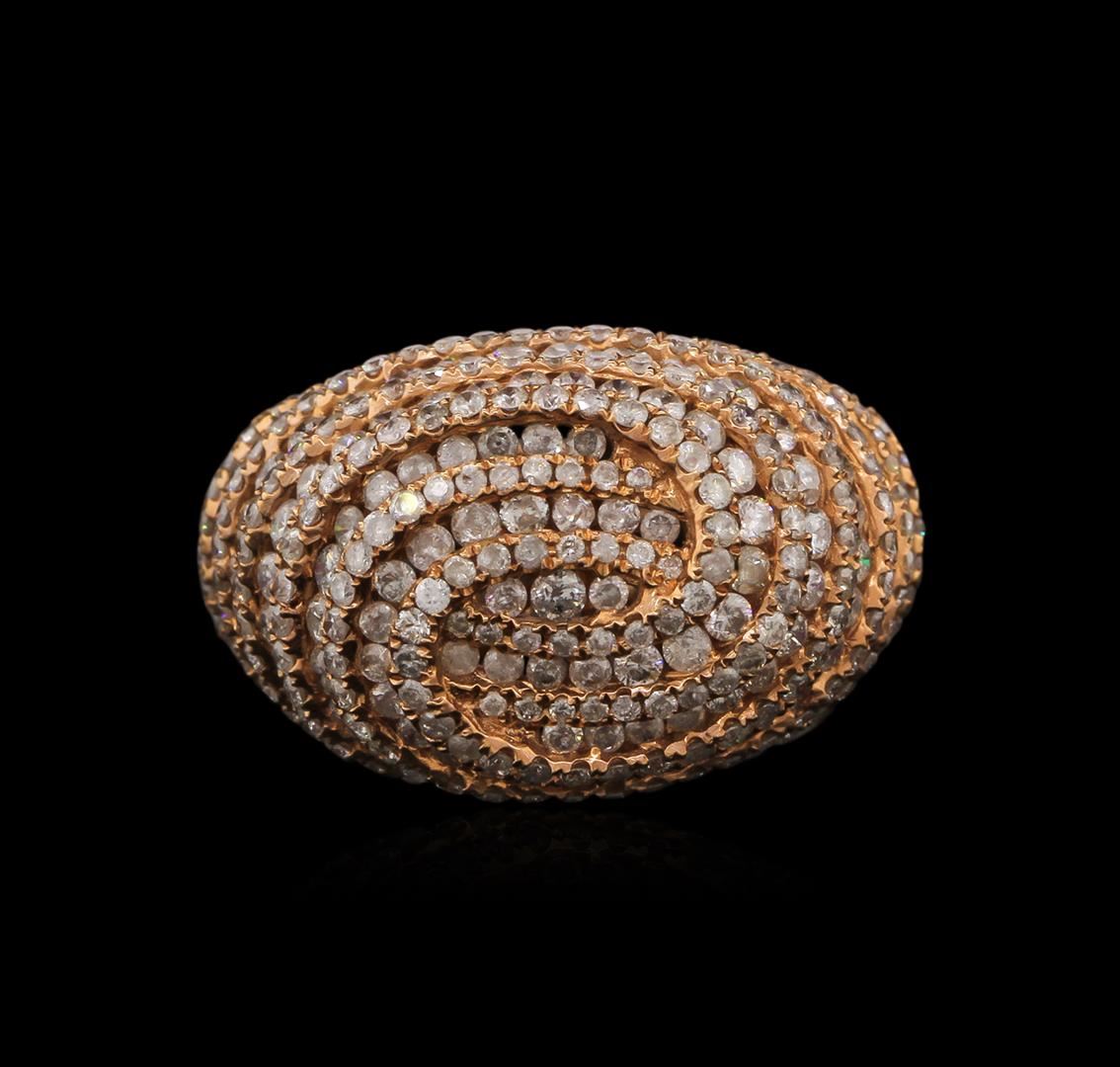 One electronically tested 14KT rose gold ladies cast diamond ring with a bright polish finish. Identified with markings of "14K". Condition is new. Containing: Three Hundred Fifty-Six prong set round brilliant cut diamonds, measuring 1.10 - 1.10 x 0.66mm (depth est.) approximate total weight of 356 Stones = 2.97ct. Clarity: I-1 to I-2. Color: I - J, Cut is Good. Diamonds are graded in the mounting, unless otherwise stated. Total Weight of Diamonds 2.97ct. Total Weight of Ring 6.70 grams. GGL Appraised at $4,275.00.