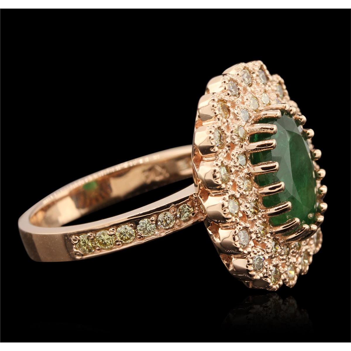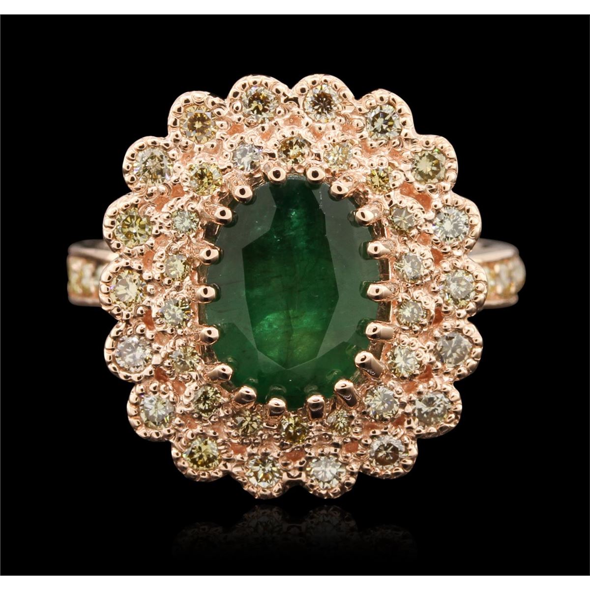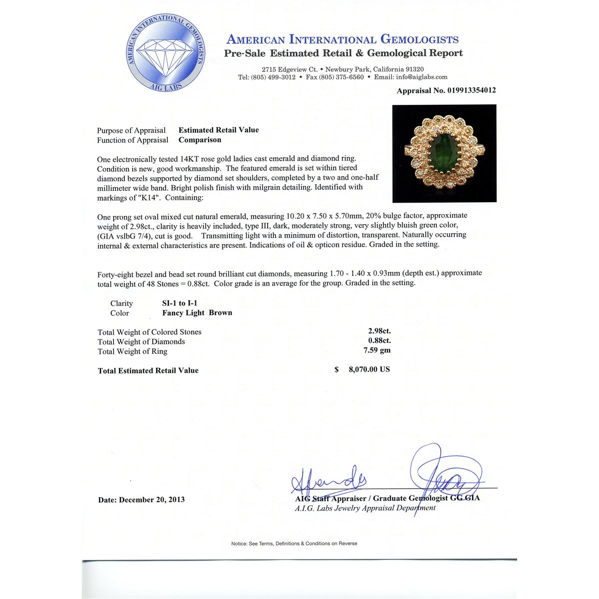 14KT rose gold 2.98ct Emerald and Diamond Ring A6615. One electronically tested 14KT rose gold ladies cast emerald and diamond ring. The featured emerald is set within tiered diamond bezels supported by diamond set shoulders, completed by a two and one-half millimeter wide band. Bright polish finish with milgrain detailing. Identified with markings of "K14". Condition is new, good workmanship. Containing: One prong set oval mixed cut natural emerald, measuring 10.20 x 7.50 x 5.70mm, 20%. bulge factor, approximate weight of 2.98ct., clarity is heavily included, type III, dark, moderately strong, very slightly bluish green color, (GIA vslbG 7/4), cut is good. Transmitting light with a minimum of distortion, transparent. Naturally occurring internal & external characteristics are present. Indications of oil & opticon residue. Graded in the setting.Forty-Eight bezel and bead set round brilliant cut diamonds, measuring 1.70 - 1.40 x 0.93mm (depth est.) approximate. Total Weight of 48 Stones = 0.88ct. Color grade is an average for the group. Graded in the setting. Clarity: SI-1 to I-1. Total Weight of Colored Stones 2.98ct. Total Weight of Diamonds 0.88ct. AIG Appraised at $8,070.00.