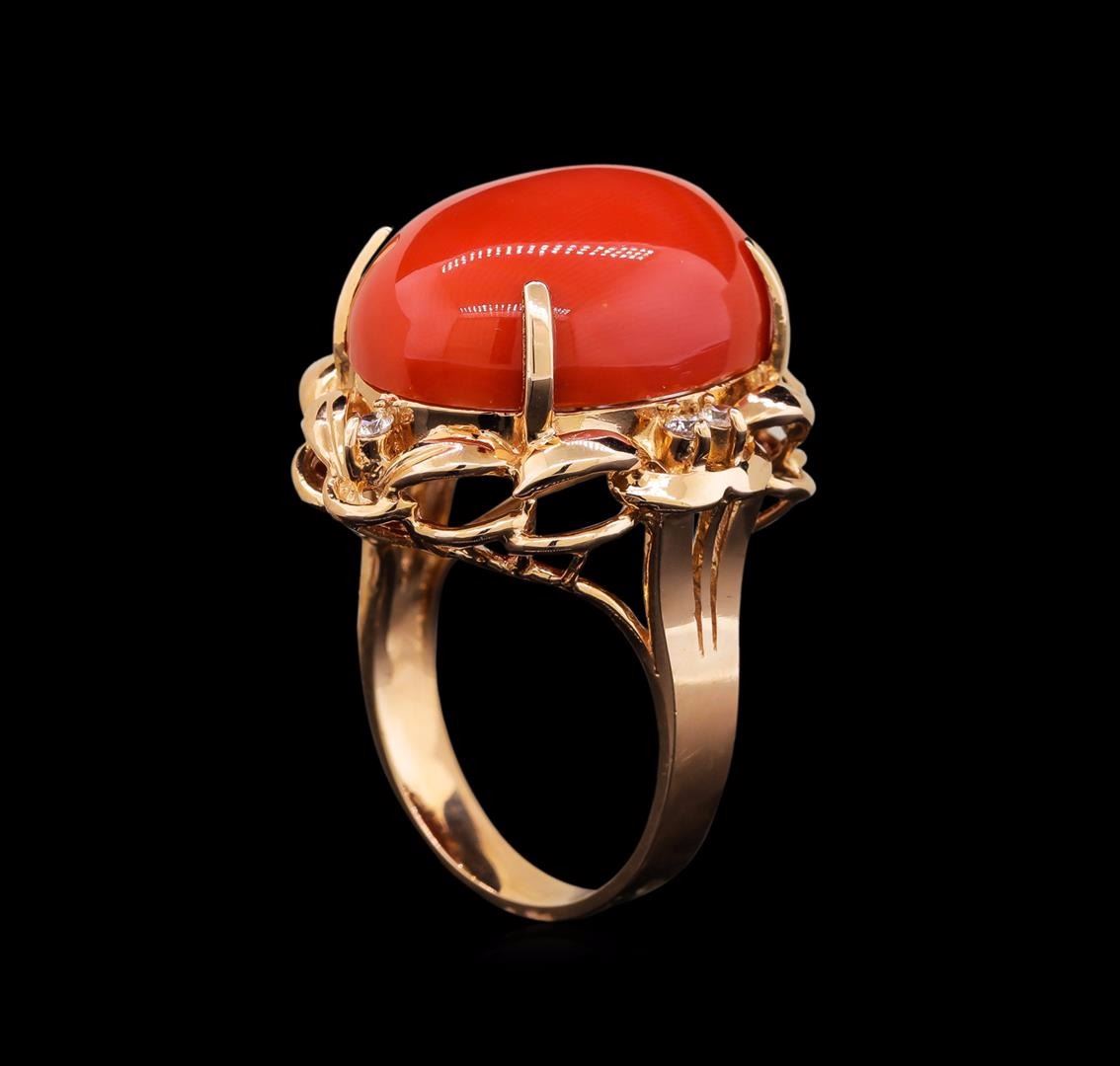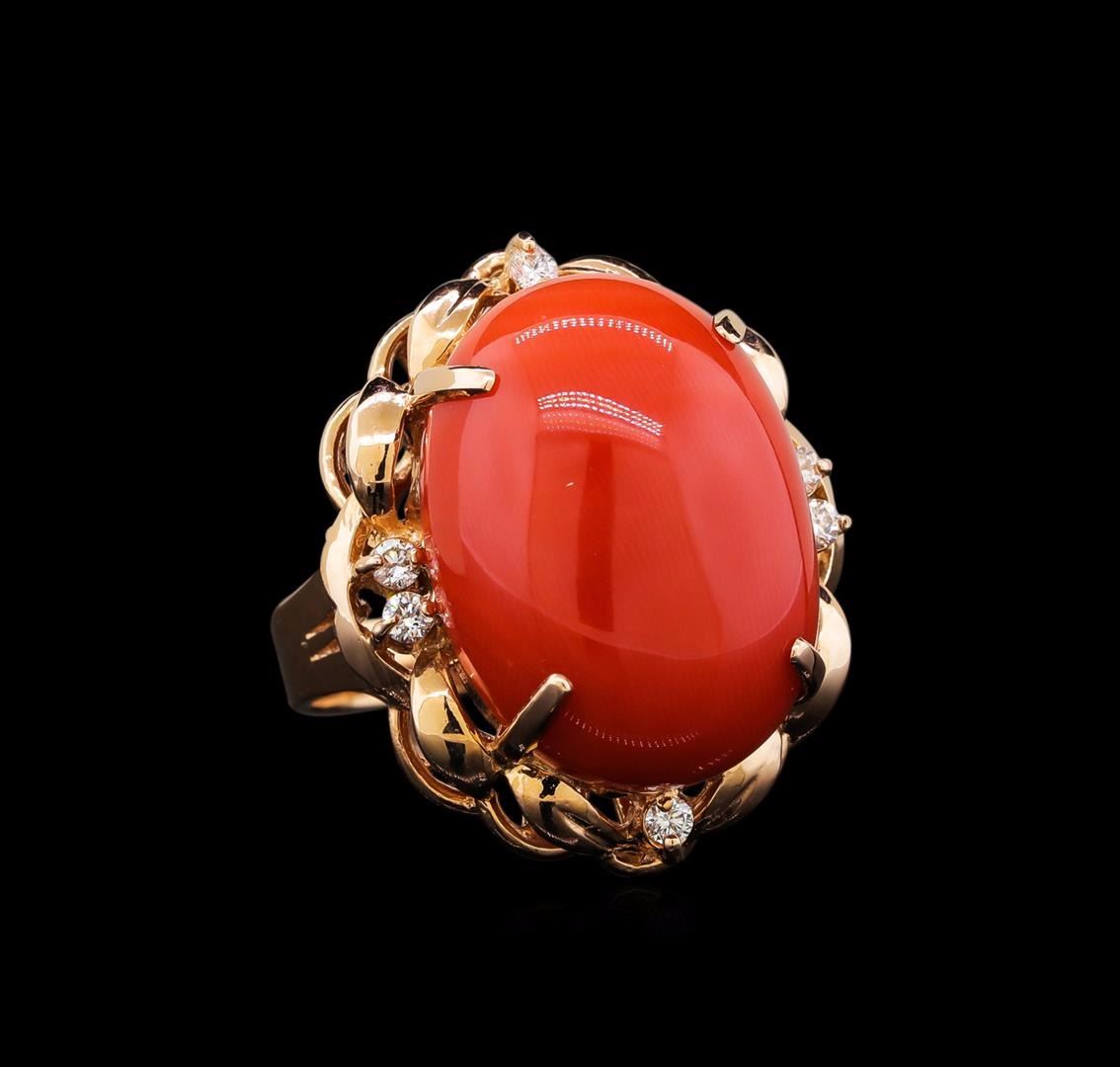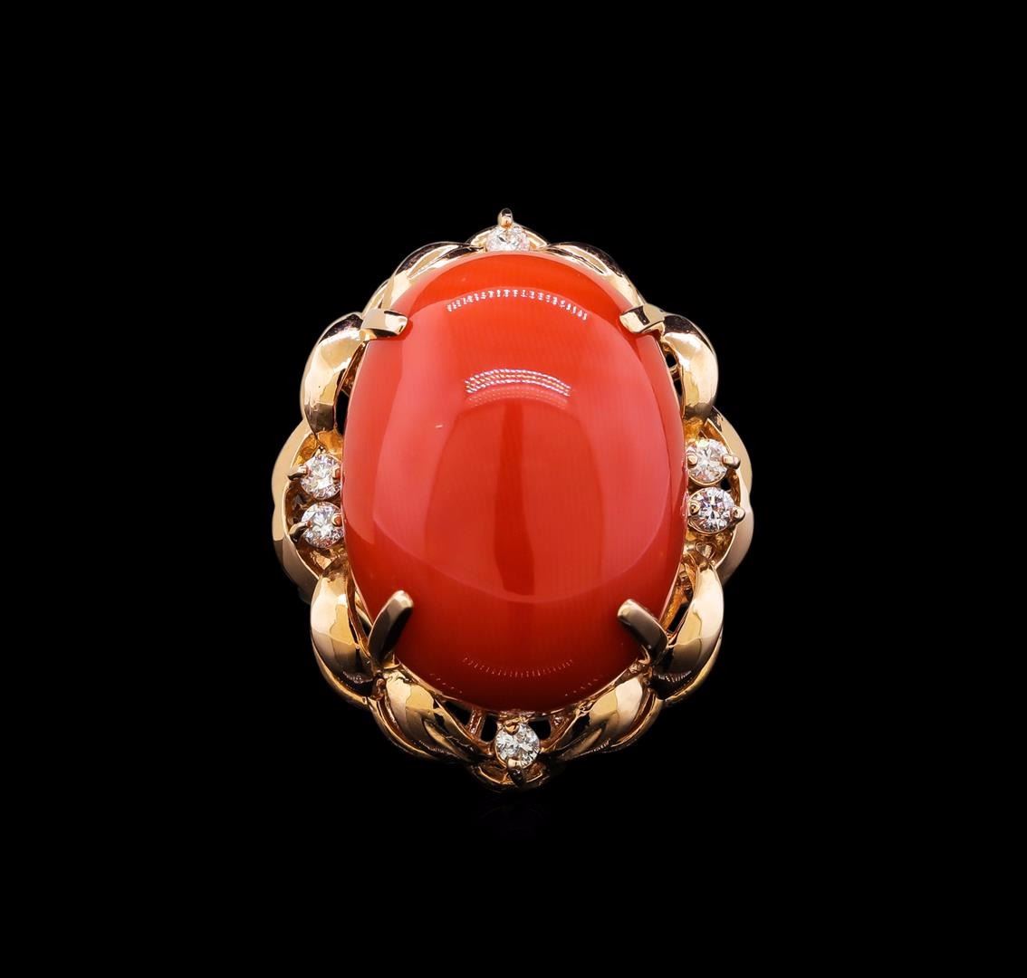 One electronically tested Gold-Rose-14KT ladies cast coral and diamond ring with a bright polish finish. Identified with markings of "14K". Condition is new. Containing: One prong set oval cabochon cut natural red coral, measuring 20.00. x 15.00. x 9.75mm, approximate weight of 20.93ct., clarity is heavily included, medium, brownish, reddish orange color, (GIA rO 5/1), cut is good. Six prong set round brilliant cut diamonds, measuring 1.80 - 1.80 x 1.08mm (depth est.) approximate total weight of 6 Stones = 0.13ct. Clarity: SI-1 to SI-2. Color: J - K. Colored gemstones are presumed to have been subjected to commonly used enhancement processes. All diamonds and colored gemstones are graded in the mounting, unless otherwise stated. Total Weight of Colored Stones 20.93ct. Total Weight of Diamonds 0.13ct. Total Weight of Ring 11.20 grams. GGL Appraised at $4,500.00.