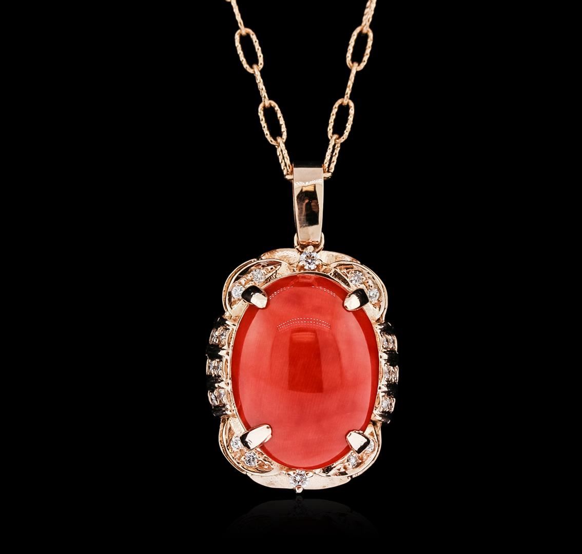 One electronically tested 14KT rose gold ladies cast coral and diamond pendant & chain 18.0" long, with a lobster claw clasp with a bright polish finish. Identified with markings of "14K". Condition is new. Containing: One prong set oval cabochon cut natural red coral, measuring 20.11 x 15.26 x 9.92mm, approximate weight of 21.78ct., clarity is heavily included, medium, brownish, reddish orange color, (GIA rO 5/1), cut is good. Twenty-Two prong set round brilliant cut diamonds, measuring 1.50 - 1.30 x 0.84mm (depth est.) approximate total weight of 22 Stones = 0.22ct. Clarity: VS-2 to SI-1. Color: I - J, Cut is Good. Colored gemstones are presumed to have been subjected to commonly used enhancement processes. All diamonds and colored gemstones are graded in the mounting, unless otherwise stated. Total Weight of Colored Stones 21.78ct. Total Weight of Diamonds 0.22ct. Total Weight of Pendant & Chain 14.40 grams. GGL Appraised at $4,775.00.