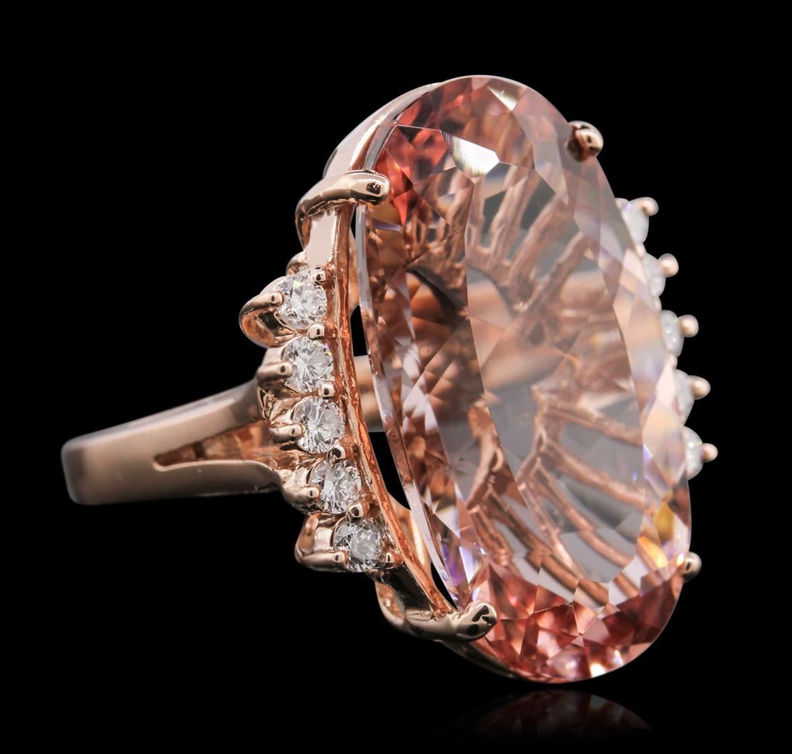 One electronically tested 14KT rose gold Ladies combination cast & assembled ring with a bright polish finish. Condition is new. Identified with markings of "K14". Containing: One prong set oval modified brilliant cut natural morganite, measuring 26.01 x 15.05 x 10.24mm, approximate weight of 23.97ct., clarity is eye clean, type I, light, brownish, reddish orange color, (GIA rO 3/1), cut is very good. GIA Report: 2151961114. Ten prong set round brilliant cut diamonds, measuring 2.40 - 2.40 x 1.44mm (depth est.) approximate. Total Weight of 10 Stones = 0.51ct. Clarity: I-1 to I-2. Color: I - J, Cut is Good. Total Weight of Colored Stones 23.97ct. Total Weight of Diamonds 0.51ct. Total Weight of Ring 13.70 grams. GGL Appraised at $18,180.00.