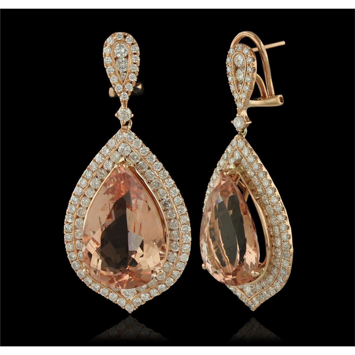One pair electronically tested 14KT rose gold ladies cast & assembled morganite and diamond dangle earrings with omega backs. Condition is new, good workmanship. Bright polish finish. Identified with markings of "585". Containing: Two prong set pear mixed cut natural morganites, measuring 20.40 x 13.50 x 7.75mm, 6%. bulge factor, approximate. Total Weight of 24.62ct., clarity is eye clean, type I, light, very slightly brownish, reddish orange color, (GIA rO 3/3), cut is good. Transmitting light with no distortion, transparent. Measurements & the color grade are an average for the pair. Graded in the setting. One Hundred Eighty prong & bead set round brilliant cut diamonds, measuring 1.80 - 1.30 x 0.93mm (depth est.) approximate. Total Weight of 180 Stones = 2.54ct. Graded in the setting. Clarity: I-1 to I-2. Color: F - H Ten prong and channel set round brilliant cut diamonds, measuring 2.70 - 2.20 x 1.47mm (depth est.) approximate. Total Weight of 10 Stones = 0.50ct. Graded in the setting. Clarity: SI-1 to I-1. Color: F - H. Total Weight of Colored Stones 24.62ct. Total Weight of Diamonds 3.04ct. Total Weight of Earrings 18.60 grams. AIG Appraised at $27,675.00.