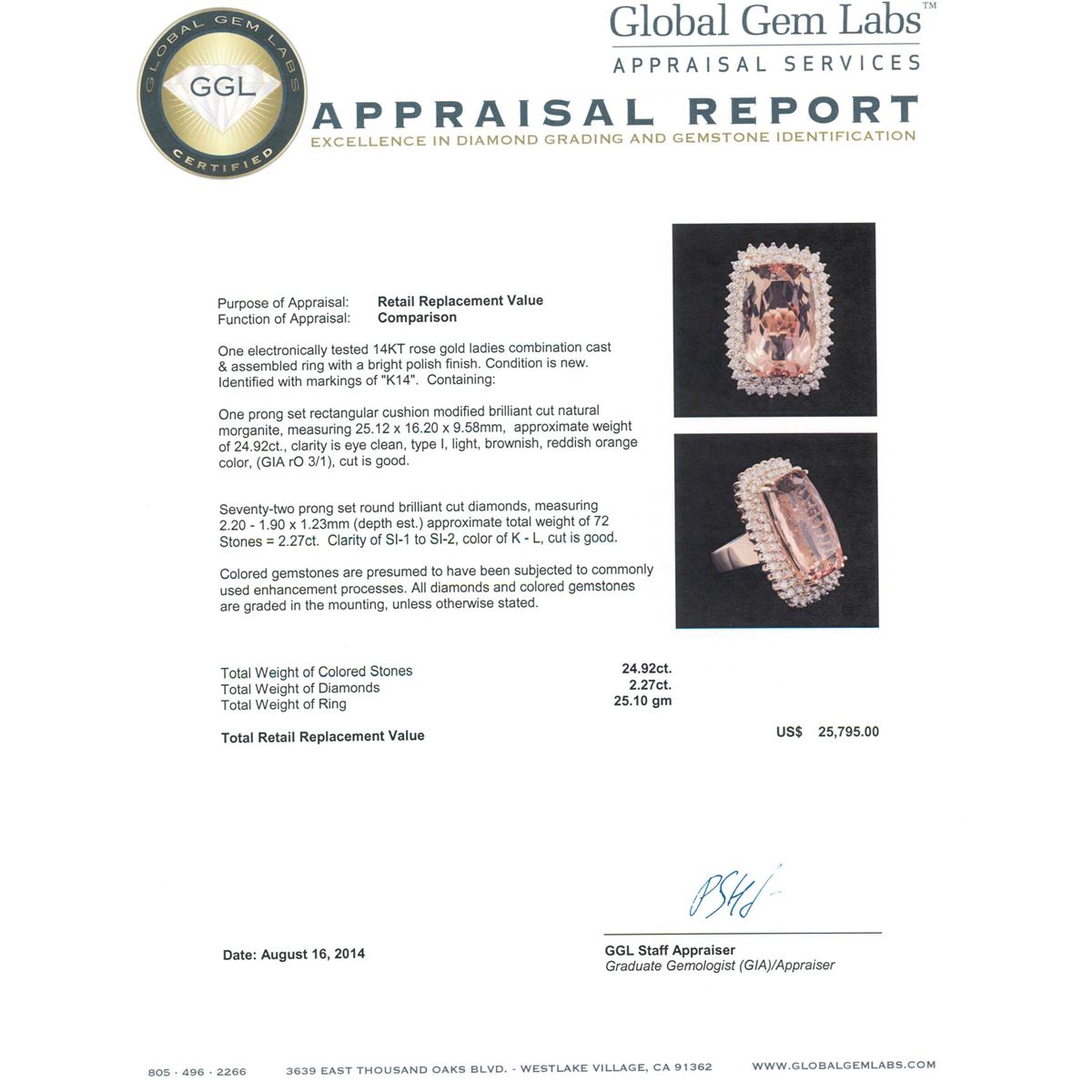 One electronically tested 14KT rose gold ladies combination cast & assembled ring with a bright polish finish. Condition is new. Identified with markings of "K14". Containing: One prong set rectangular cushion modified brilliant cut natural morganite, measuring 25.12 x 16.20 x 9.58mm, approximate weight of 24.92ct., clarity is eye clean, type I, light, brownish, reddish orange color, (GIA rO 3/1), cut is good. Seventy-Two prong set round brilliant cut diamonds, measuring 2.20 - 1.90 x 1.23mm (depth est.) approximate. Total Weight of 72 Stones = 2.27ct. Clarity: SI-1 to SI-2. Color: K - L, Cut is Good. Colored gemstones are presumed to have been subjected to commonly used enhancement processes. All diamonds and colored gemstones are graded in the mounting, unless otherwise stated. Total Weight of Colored Stones 24.92ct. Total Weight of Diamonds 2.27ct. Total Weight of Ring 25.10 grams. GGL Appraised at $25,795.00.