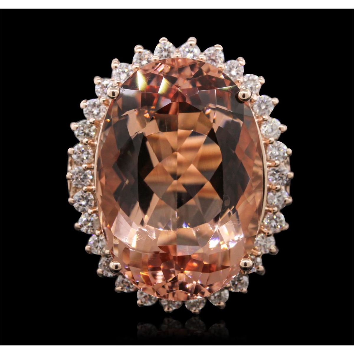 One electronically tested 14KT rose gold ladies cast morganite and diamond ring with a bright polish finish. Condition is new, good workmanship. The featured morganite is set within a diamond bezel supported by tapering shoulders, completed by a two and one-half millimeter wide band. Identified with markings of "K14". Containing: One prong set oval modified brilliant cut natural morganite, measuring 23.92 x 16.43 x 10.73mm, exact weight 26.36ct., type I Clarity is eye clean, medium, very slightly brownish, pinkish orange color, (GIA piO 5/3), cut is good. Transmitting light with no distortion, transparent. GIA Gemological Report attached. Graded loose prior to setting in the GIA Laboratory, Report #2151962020.Thirty prong set round brilliant cut diamonds, measuring 2.30 - 2.20 x 1.35mm (depth est.) approximate. Total Weight of 30 Stones = 1.35ct. Graded in the setting. Clarity: SI-1 to I-1. Color: G - I. Total Weight of Colored Stones 26.36ct. Total Weight of Diamonds 1.35ct. Total Weight of Ring 14.07 grams. AIG Appraised at $26,175.00.