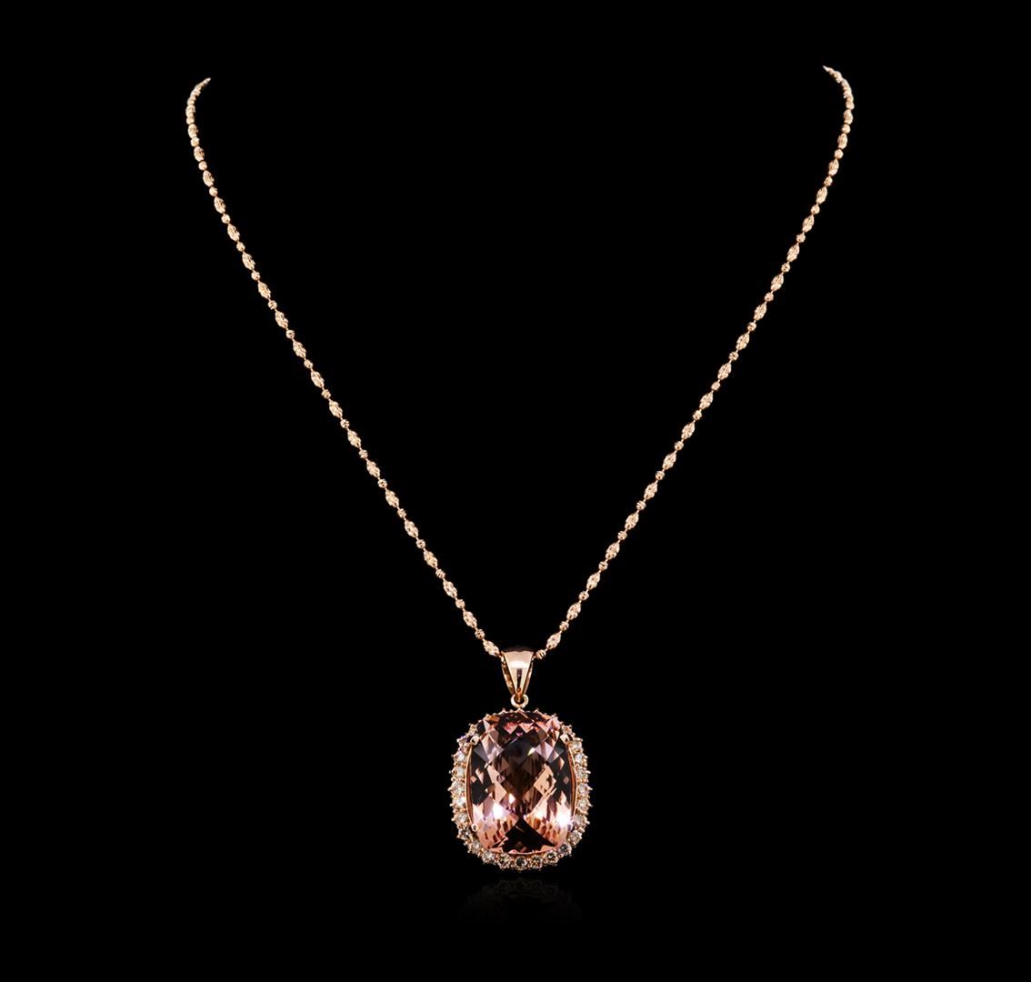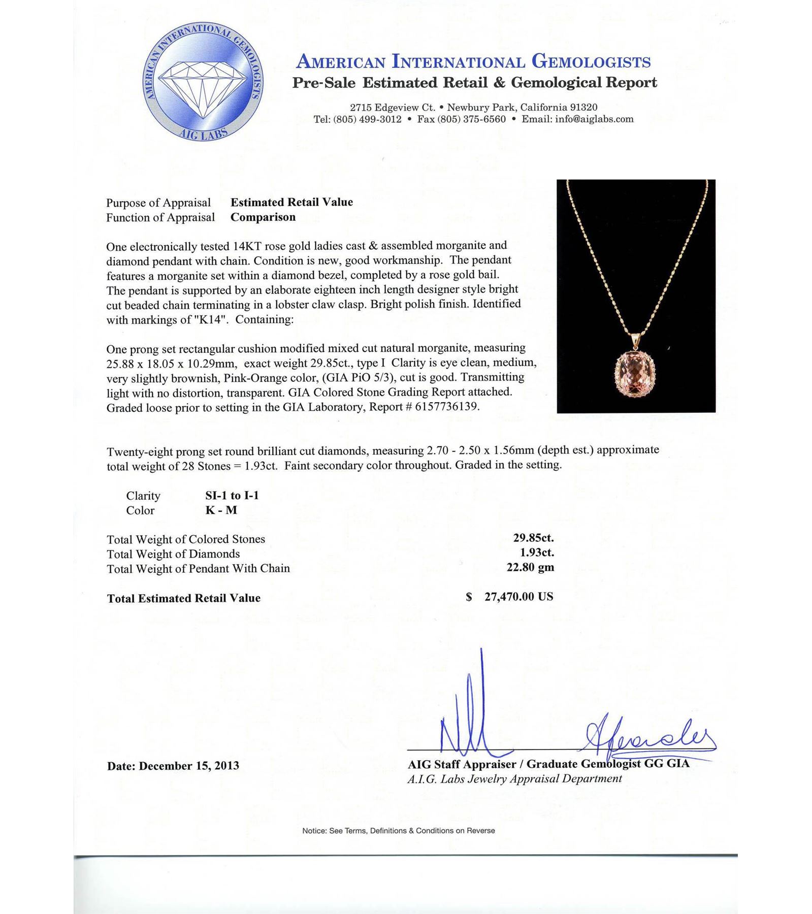 One electronically tested 14KT rose gold ladies cast & assembled morganite and diamond pendant with chain. The pendant features a morganite set within a diamond bezel, completed by a rose gold bail. The pendant is supported by an elaborate eighteen inch length designer style bright cut beaded chain terminating in a lobster claw clasp. Bright polish finish. Identified with markings of "K14". Condition is new, good workmanship. Containing: One prong set rectangular cushion modified mixed cut natural morganite, measuring 25.88 x 18.05 x 10.29mm, exact weight 29.85ct., type I Clarity is eye clean, medium, very slightly brownish, Pink-Orange color, (GIA PiO 5/3), cut is good. Transmitting light with no distortion, transparent. GIA Colored Stone Grading Report attached. Graded loose prior to setting in the GIA Laboratory, Report # 6157736139.Twenty-Eight prong set round brilliant cut diamonds, measuring 2.70 - 2.50 x 1.56mm (depth est.) approximate. Total Weight of 28 Stones = 1.93ct. Faint secondary color throughout. Graded in the setting. Clarity: SI-1 to I-1 . Color: K - M. Total Weight of Colored Stones 29.85ct.. Total Weight of Diamonds 1.93ct. AIG Appraised at $27,470.00.