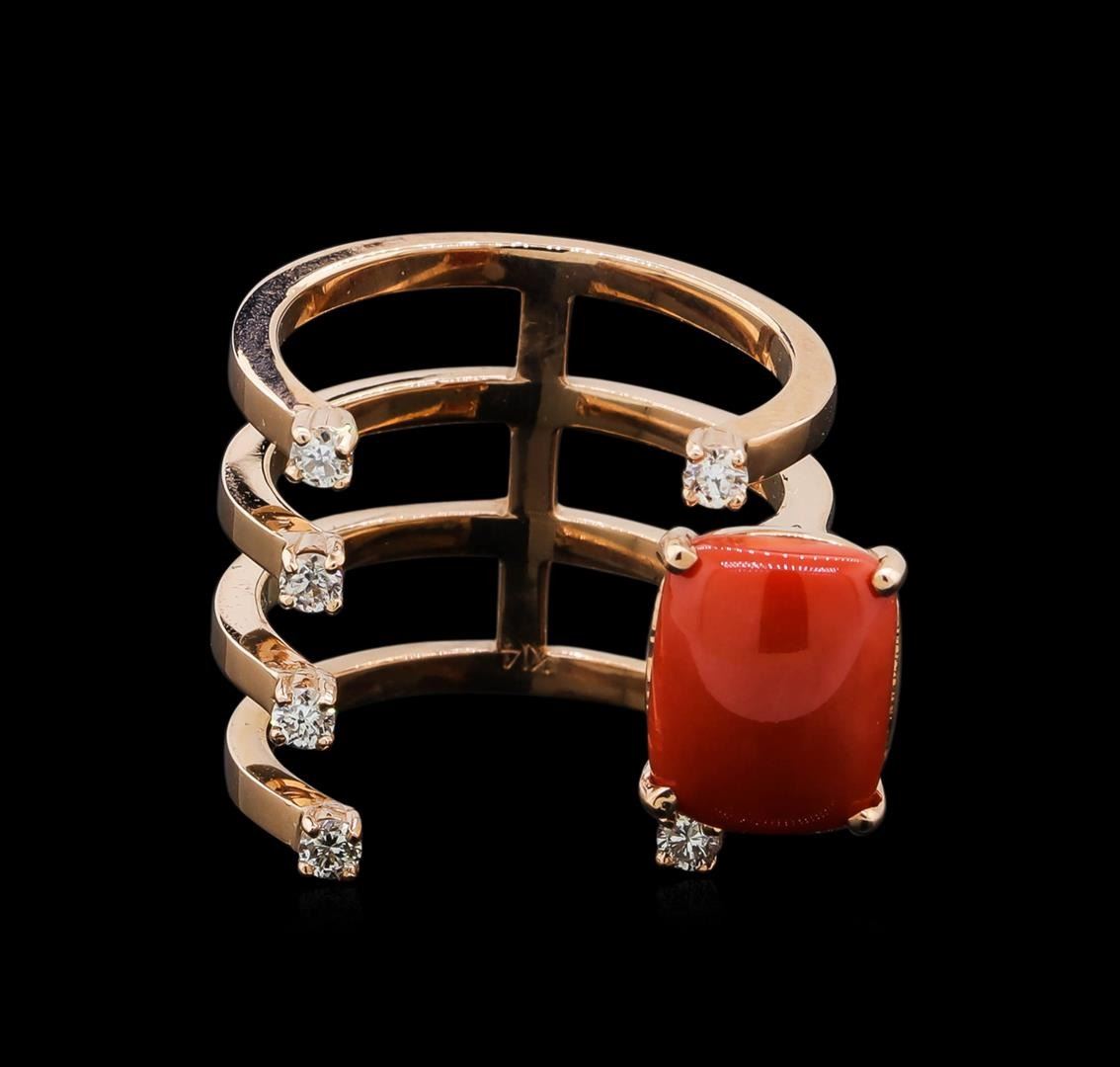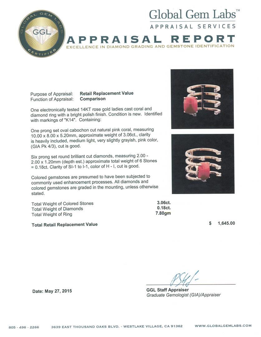 One electronically tested 14KT rose gold ladies cast coral and diamond ring with a bright polish finish. Identified with markings of "K14". Condition is new. Containing: One prong set oval cabochon cut natural pink coral, measuring 10.00 x 8.00 x 5.20mm, approximate weight of 3.06ct., clarity is heavily included, medium light, very slightly grayish, pink color, (GIA Pk 4/3), cut is good. Six prong set round brilliant cut diamonds, measuring 2.00 - 2.00 x 1.20mm (depth est.) approximate total weight of 6 Stones = 0.18ct. Clarity: SI-1 to I-1. Color: H - I, Cut is Good. Colored gemstones are presumed to have been subjected to commonly used enhancement processes. All diamonds and colored gemstones are graded in the mounting, unless otherwise stated. Total Weight of Colored Stones 3.06ct. Total Weight of Diamonds 0.18ct. Total Weight of Ring 7.80 grams. GGL Appraised.