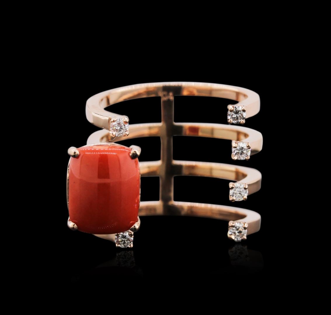 One electronically tested 14KT rose gold ladies cast coral and diamond ring with a bright polish finish. Identified with markings of "K14". Condition is new. Containing: One prong set oval cabochon cut natural pink coral, measuring 10.00 x 8.00 x 5.20mm, approximate weight of 3.06ct., clarity is heavily included, medium light, very slightly grayish, pink color, (GIA Pk 4/3), cut is good. Six prong set round brilliant cut diamonds, measuring 2.00 - 2.00 x 1.20mm (depth est.) approximate total weight of 6 Stones = 0.18ct. Clarity: SI-1 to I-1. Color: H - I, Cut is Good. Colored gemstones are presumed to have been subjected to commonly used enhancement processes. All diamonds and colored gemstones are graded in the mounting, unless otherwise stated. Total Weight of Colored Stones 3.06ct. Total Weight of Diamonds 0.18ct. Total Weight of Ring 7.80 grams. GGL Appraised at $1,645.00.