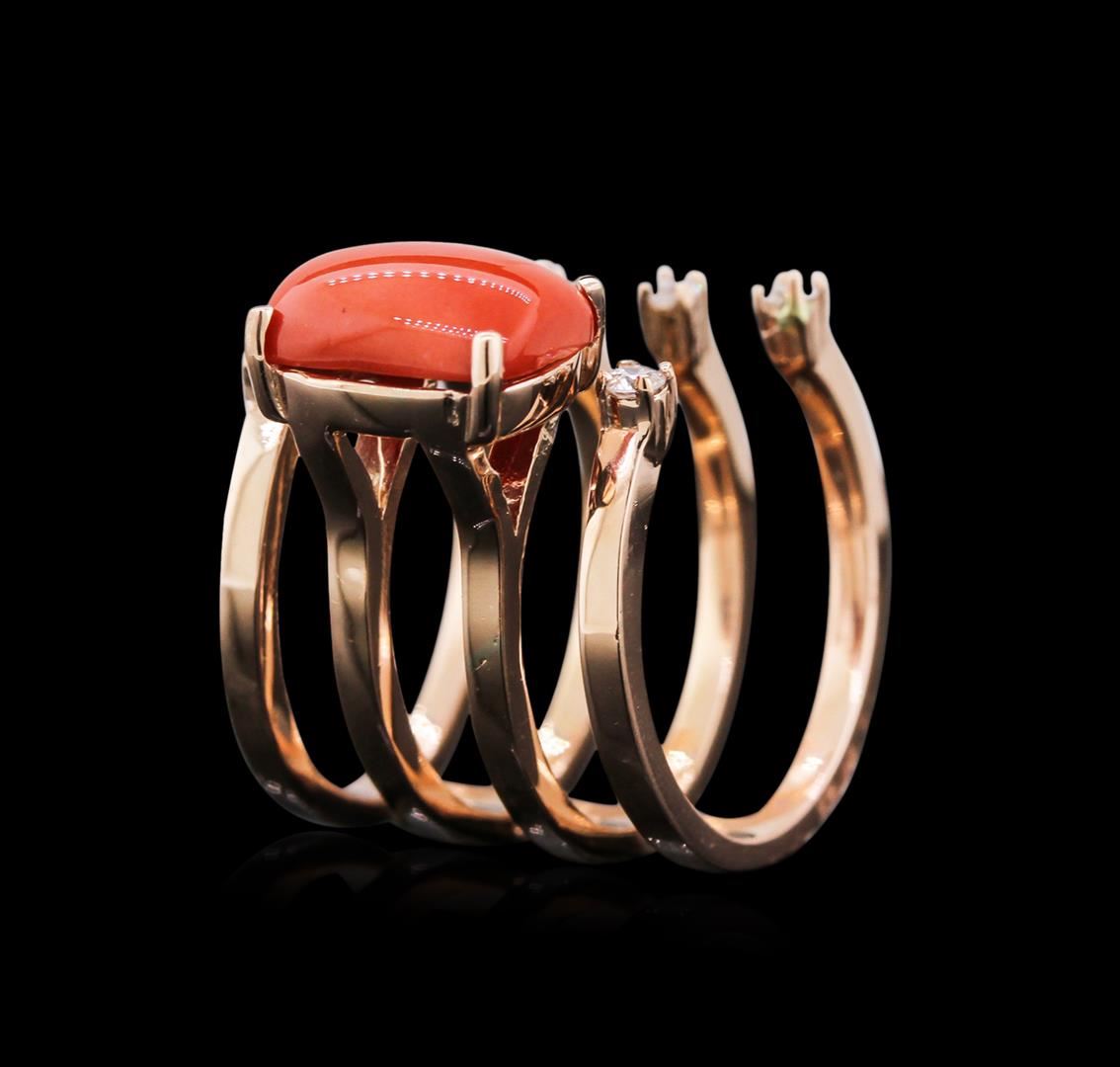 One electronically tested 14KT rose gold ladies cast coral and diamond ring with a bright polish finish. Identified with markings of "K14". Condition is new. Containing: One prong set oval cabochon cut natural pink coral, measuring 10.00 x 8.00 x 5.20mm, approximate weight of 3.06ct., clarity is heavily included, medium light, very slightly grayish, pink color, (GIA Pk 4/3), cut is good. Six prong set round brilliant cut diamonds, measuring 2.00 - 2.00 x 1.20mm (depth est.) approximate total weight of 6 Stones = 0.18ct. Clarity: SI-1 to I-1. Color: H - I, Cut is Good. Colored gemstones are presumed to have been subjected to commonly used enhancement processes. All diamonds and colored gemstones are graded in the mounting, unless otherwise stated. Total Weight of Colored Stones 3.06ct. Total Weight of Diamonds 0.18ct. Total Weight of Ring 7.80 grams. GGL Appraised at $1,645.00.