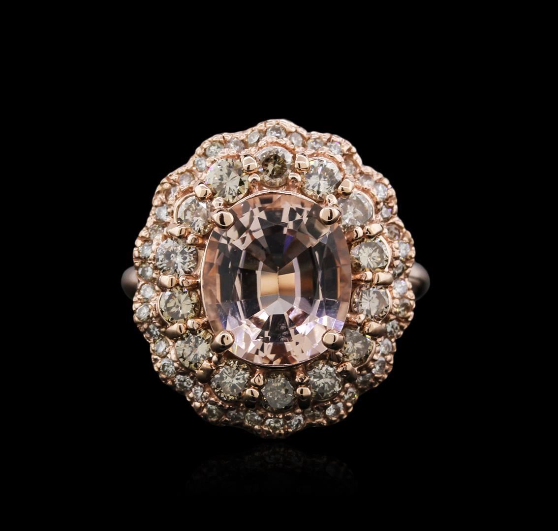 One electronically tested 14KT rose gold ladies cast morganite and diamond ring with a bright polish finish. Identified with markings of "K14". Condition is new. Containing: One prong set oval modified brilliant cut natural morganite, measuring 10.64 x 9.27 x 5.56mm, approximate weight of 3.13ct., clarity is eye clean, type I, light, brownish, reddish orange color, (GIA rO 3/1), cut is good. Fourteen prong set round brilliant cut diamonds, measuring 2.50 - 2.50 x 1.50mm (depth est.) approximate total weight of 14 Stones = 0.80 ct. Clarity: I-2 to I-3. Color: L - M, Cut is Good. Forty-Two prong set round brilliant cut diamonds, measuring 1.30 - 1.30 x 0.78mm (depth est.) approximate total weight of 42 Stones = 0.34ct. Clarity: I-1 to I-2. Color: J - K, Cut is Good. Diamonds and colored gemstones are graded in the mounting, unless otherwise stated. Colored gemstones are presumed to have been subjected to commonly used enhancement processes. Total Weight of Colored Stones 3.13ct. Total Weight of Diamonds 1.14ct. Total Weight of Ring 8.10 grams. GGL Appraised.