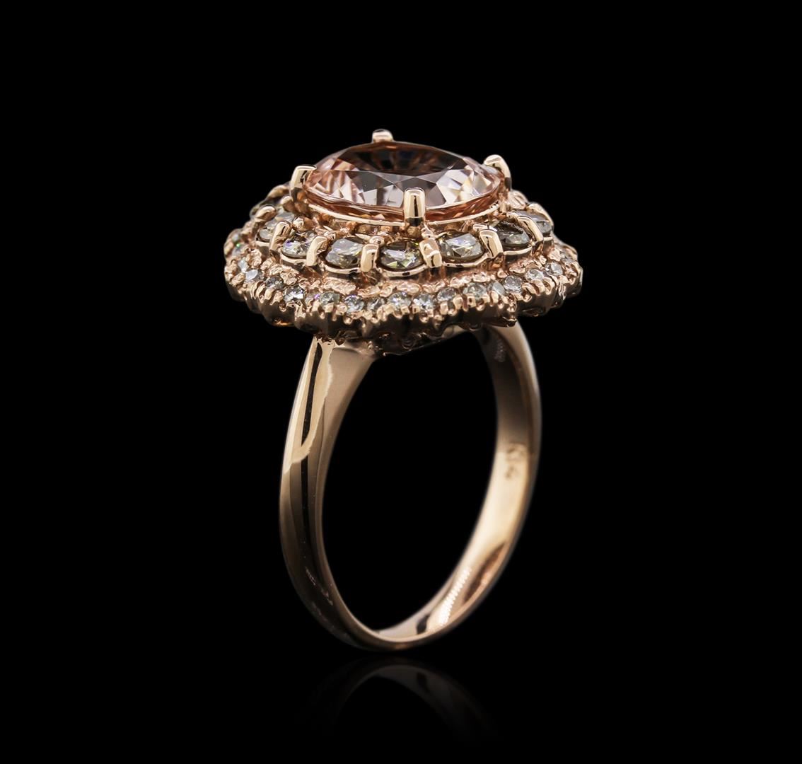 One electronically tested 14KT rose gold ladies cast morganite and diamond ring with a bright polish finish. Identified with markings of "K14". Condition is new. Containing: One prong set oval modified brilliant cut natural morganite, measuring 10.64 x 9. GGL Appraised at $2,790.00.