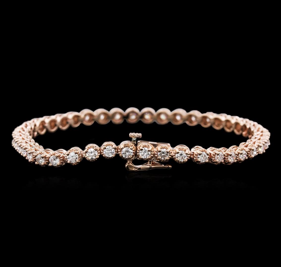One electronically tested 14KT rose gold ladies cast diamond tennis bracelet with a hidden box clasp with safety closer with a bright polish finish. Measurements: 7" in length Identified with markings of "14K". Condition is new. Containing: Forty-Four prong set round brilliant cut diamonds, measuring 2.50 - 2.50 x 1.50mm (depth est.) approximate total weight of 44 Stones = 3.15ct. Clarity: SI-1 to I-1. Color: I - J, Cut is Good. Diamonds are graded in the mounting, unless otherwise stated. Total Weight of Diamonds 3.15ct. Total Weight of Tennis Bracelet 11.90 grams. GGL Appraised at $6,180.00.