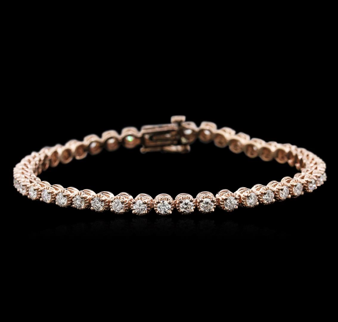 One electronically tested 14KT rose gold ladies cast diamond tennis bracelet with a hidden box clasp with safety closer with a bright polish finish. Measurements: 7" in length Identified with markings of "14K". Condition is new. Containing: Forty-Four prong set round brilliant cut diamonds, measuring 2.50 - 2.50 x 1.50mm (depth est.) approximate total weight of 44 Stones = 3.15ct. Clarity: SI-1 to I-1. Color: I - J, Cut is Good. Diamonds are graded in the mounting, unless otherwise stated. Total Weight of Diamonds 3.15ct. Total Weight of Tennis Bracelet 11.90 grams. GGL Appraised at $6,180.00.