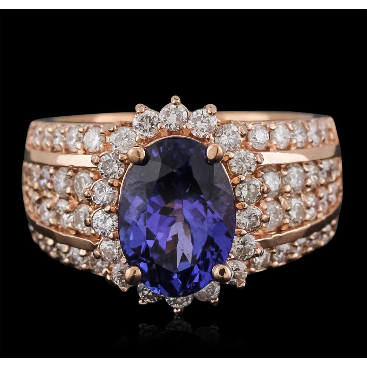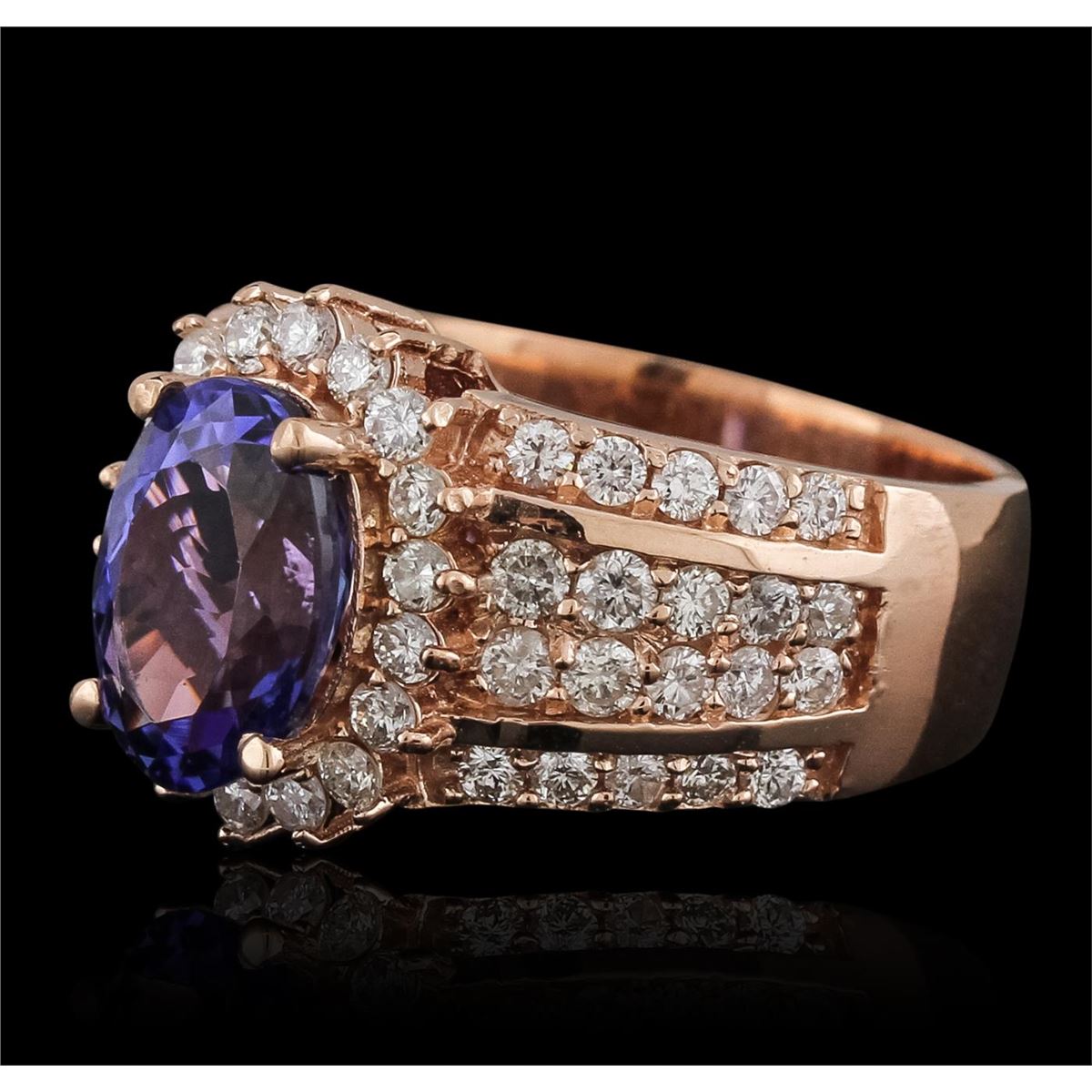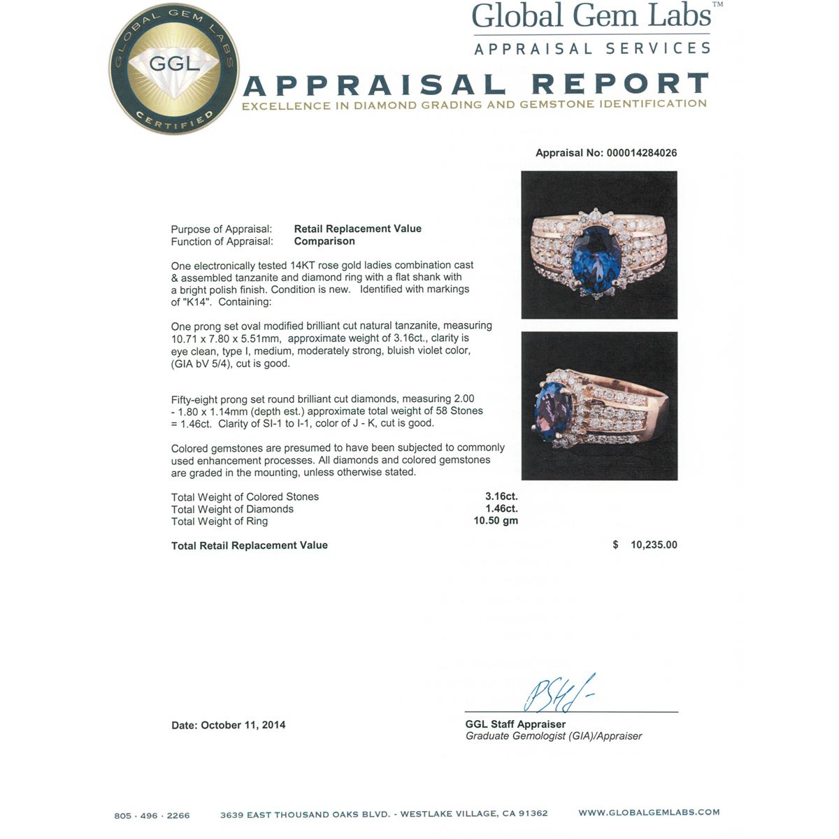 One electronically tested 14KT rose gold ladies combination cast & assembled tanzanite and diamond ring with a flat shank with a bright polish finish. Identified with markings of "K14". Condition is new. Containing: One prong set oval modified brilliant cut natural tanzanite, measuring 10.71 x 7.80 x 5.51mm, approximate weight of 3.16ct., clarity is eye clean, type I, medium, moderately strong, bluish violet color, (GIA bV 5/4), cut is good. Fifty-Eight prong set round brilliant cut diamonds, measuring 2.00 - 1.80 x 1.14mm (depth est.) approximate total weight of 58 Stones = 1.46ct. Clarity: SI-1 to I-1. Color: J - K, Cut is Good. Colored gemstones are presumed to have been subjected to commonly used enhancement processes. All diamonds and colored gemstones are graded in the mounting, unless otherwise stated. Total Weight of Colored Stones 3.16ct. Total Weight of Diamonds 1.46ct. Total Weight of Ring 10.50 grams. GGL Appraised at $10,235.00.