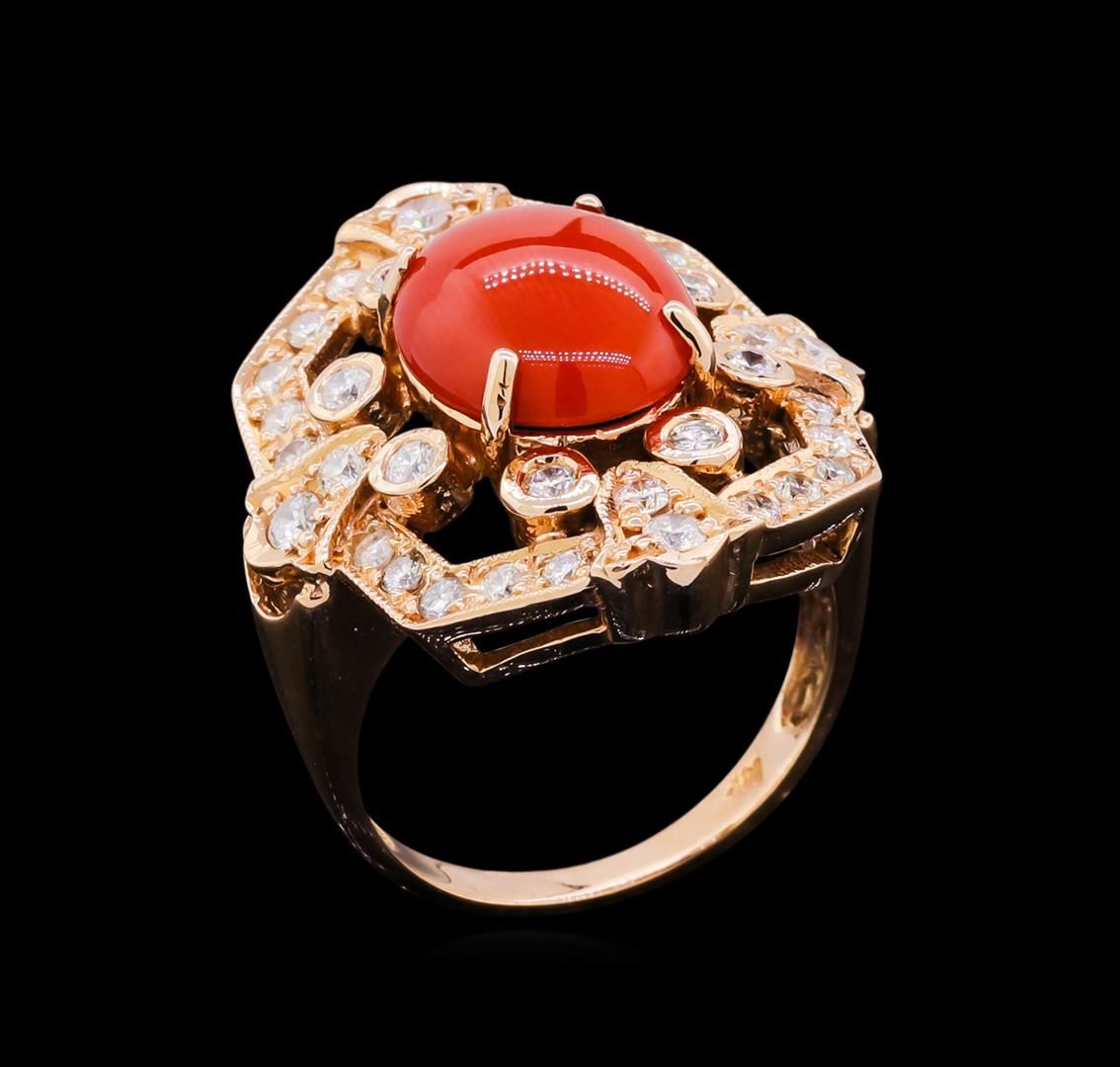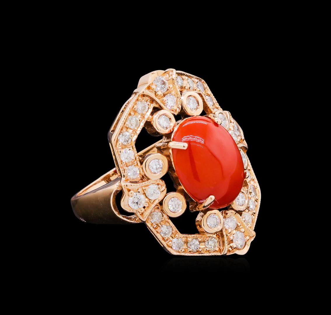 One polished, stamped, and electronically tested solid 14K rose gold ring mounted with: 1 genuine coral center stone weighing 3.17 carats and 36 genuine round full cut diamonds weighing 0.97 carats. This item weighs 8.2 grams, condition is new, excellent workmanship. AIGL Appraised at $4,800.00.