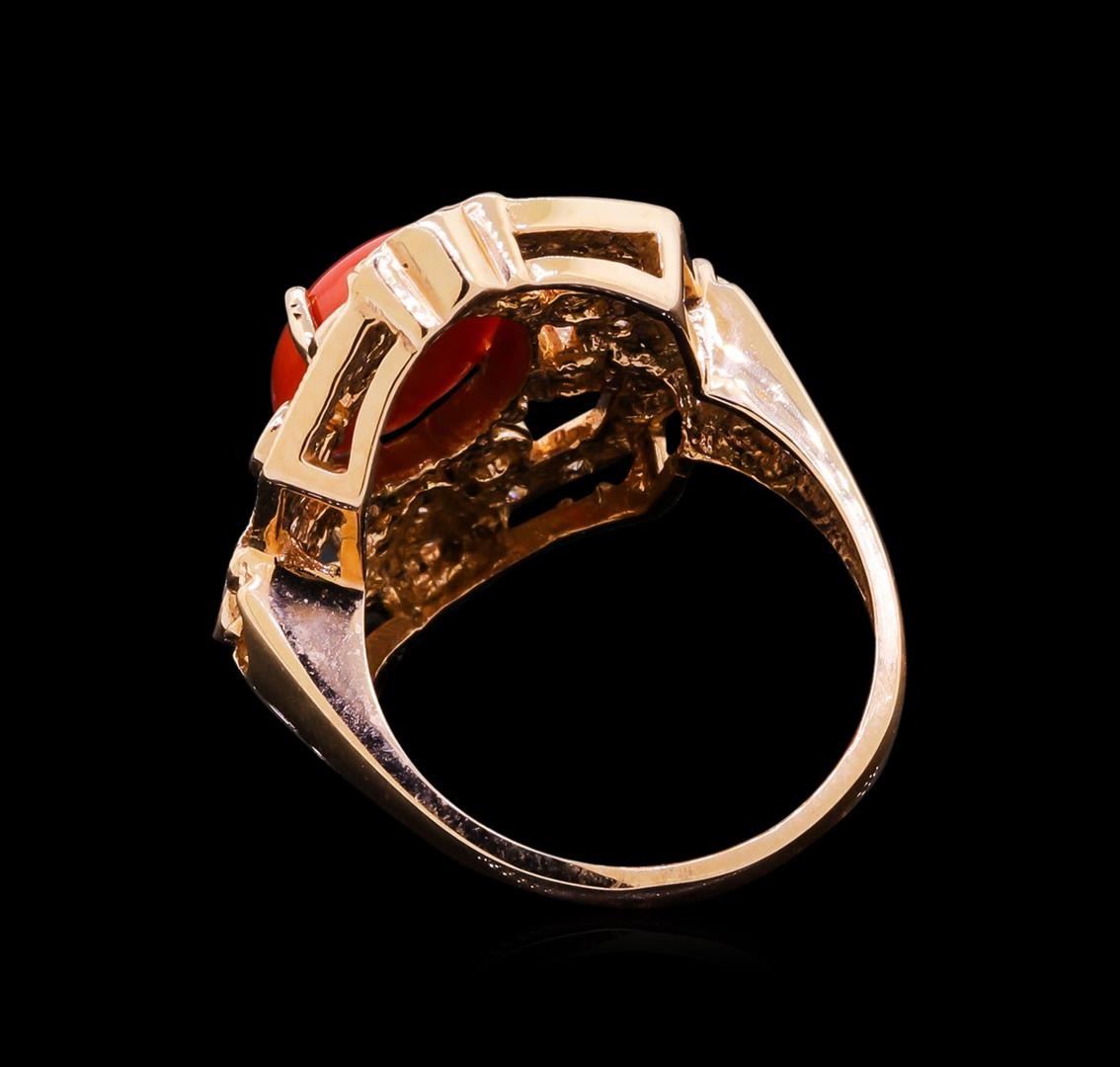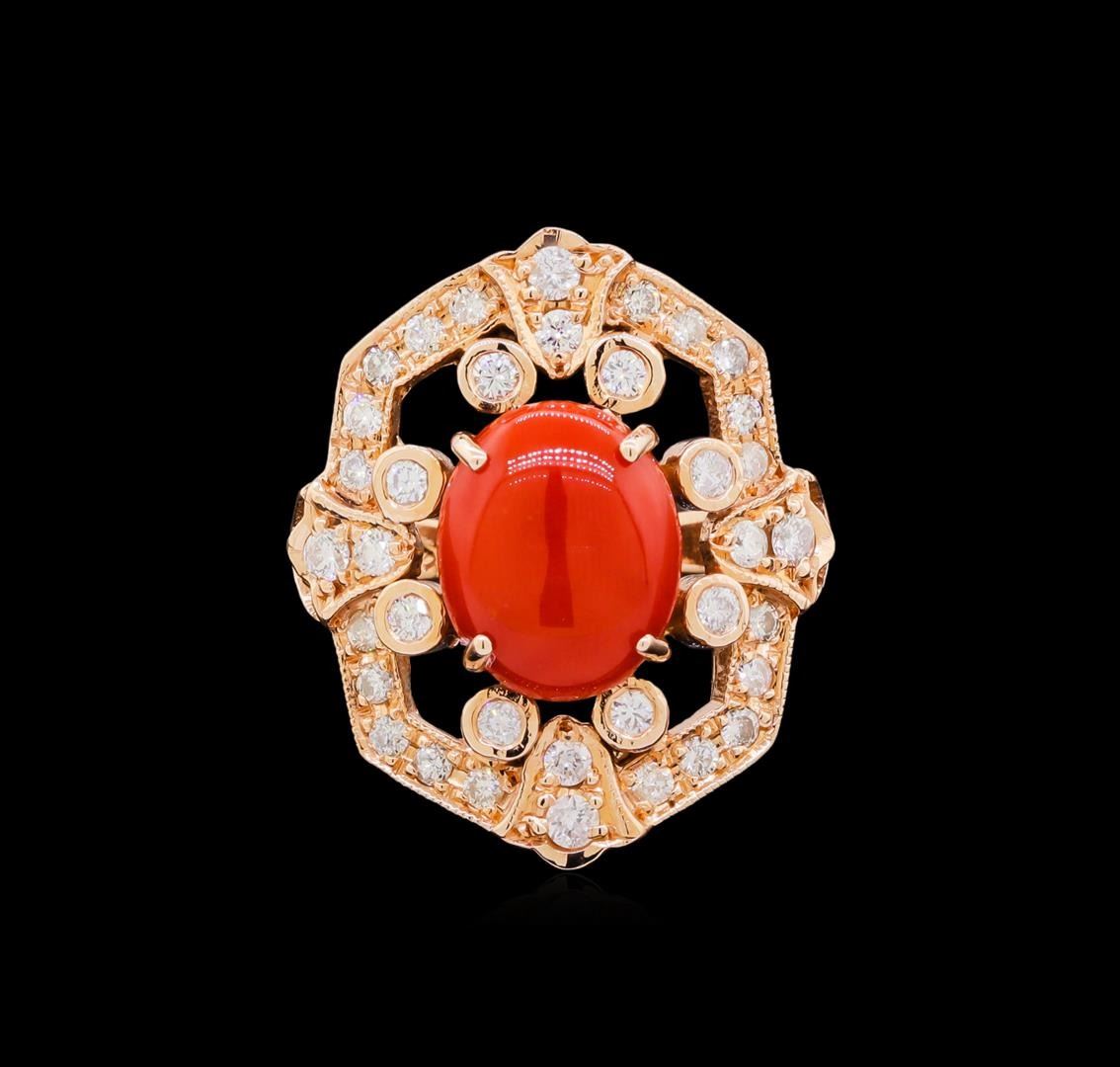One polished, stamped, and electronically tested solid 14K rose gold ring mounted with: 1 genuine coral center stone weighing 3.17 carats and 36 genuine round full cut diamonds weighing 0.97 carats. This item weighs 8.2 grams, condition is new, excellent workmanship. AIGL Appraised at $4,800.00.