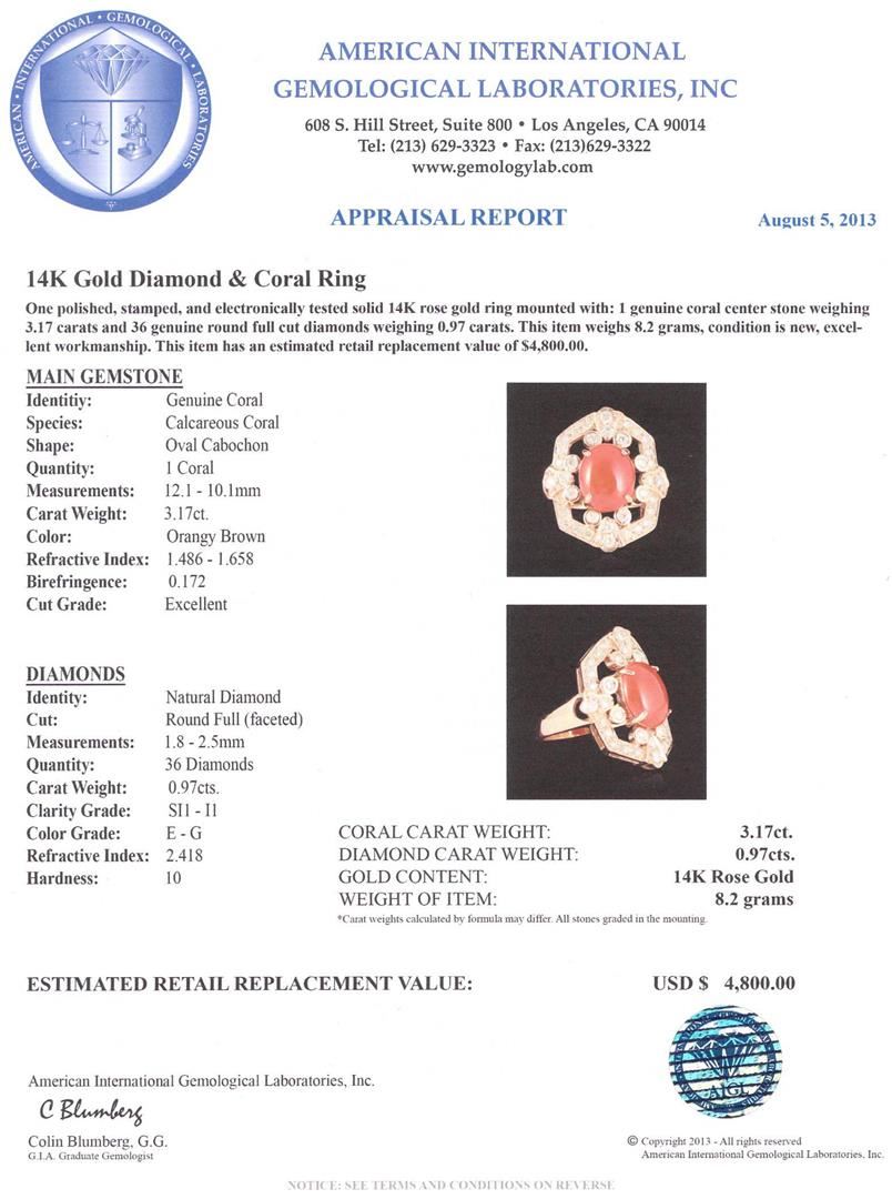 One polished, stamped, and electronically tested solid 14K rose gold ring mounted with: 1 genuine coral center stone weighing 3.17 carats and 36 genuine round full cut diamonds weighing 0.97 carats. This item weighs 8.2 grams, condition is new, excellent workmanship. AIGL Appraised at $4,800.00.