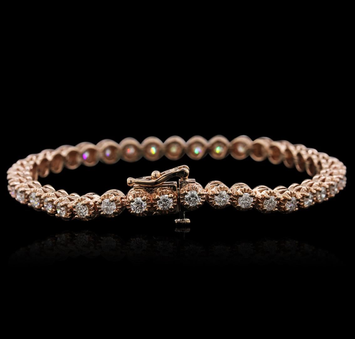 One electronically tested 14KT rose gold ladies cast diamond tennis bracelet with a hidden box clasp with safety closer with a bright polish finish. Measurements: 7" in length Identified with markings of "14K". Condition is new. Containing: Thirty-Nine prong set round brilliant cut diamonds, measuring 2.80 - 2.80 x 1.68mm (depth est.) approximate total weight of 39 Stones = 3.28ct. Clarity: SI-2 to I-1. Color: H - I, Cut is Good. All diamonds are graded in the mounting, unless otherwise stated. Total Weight of Diamonds 3.28ct. Total Weight of Tennis Bracelet 14.70 grams. GGL Appraised at $8,035.00.