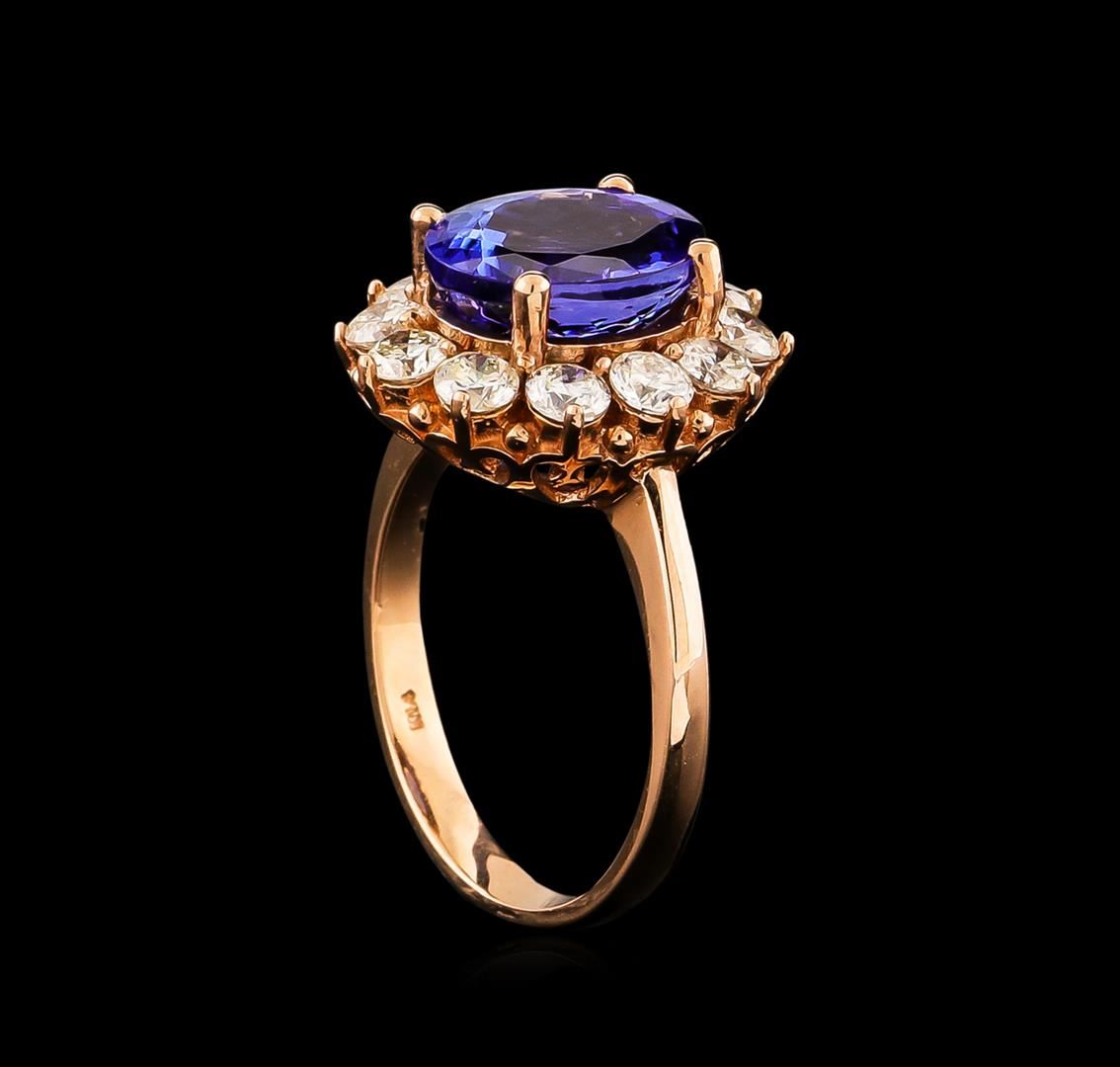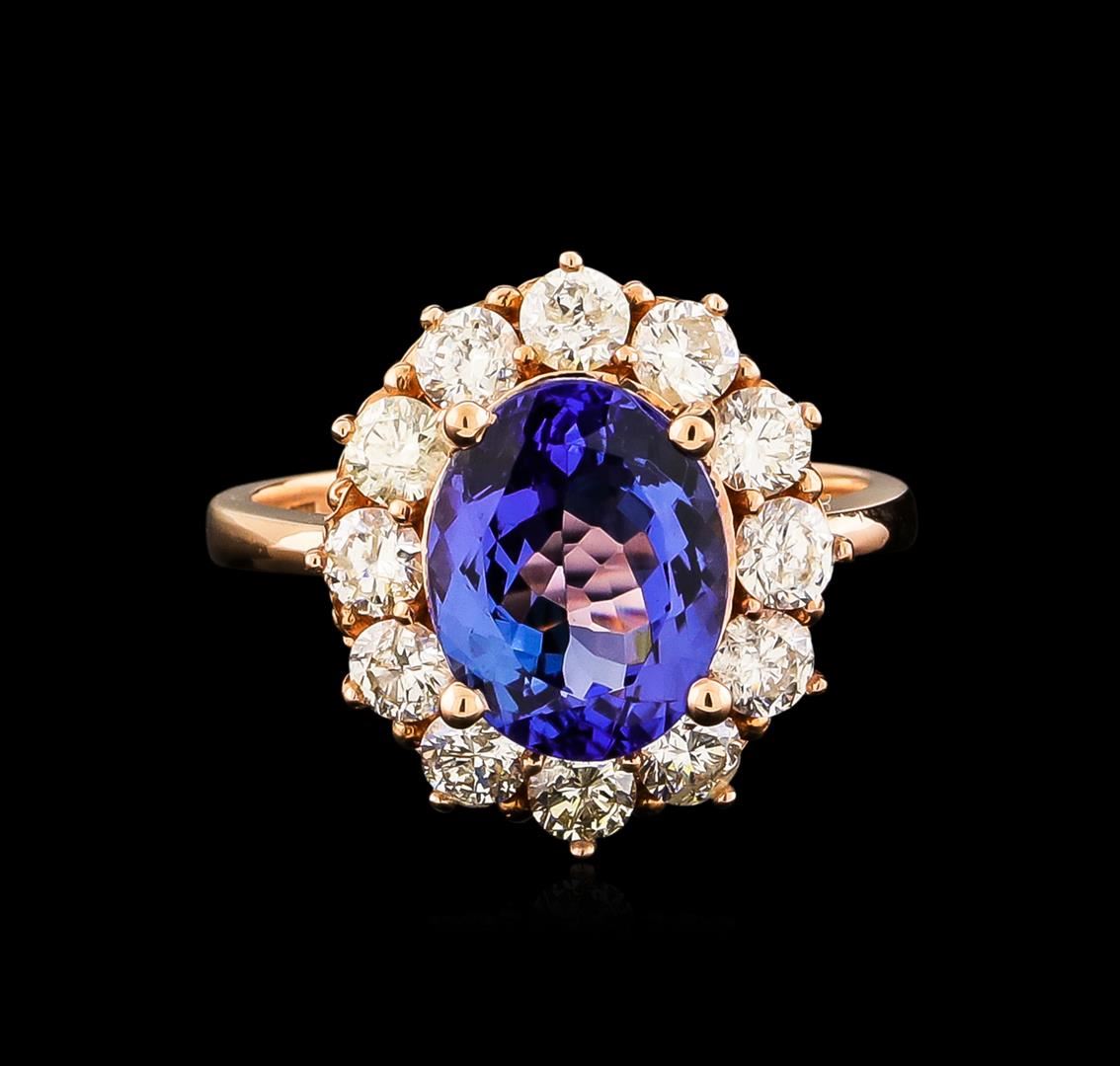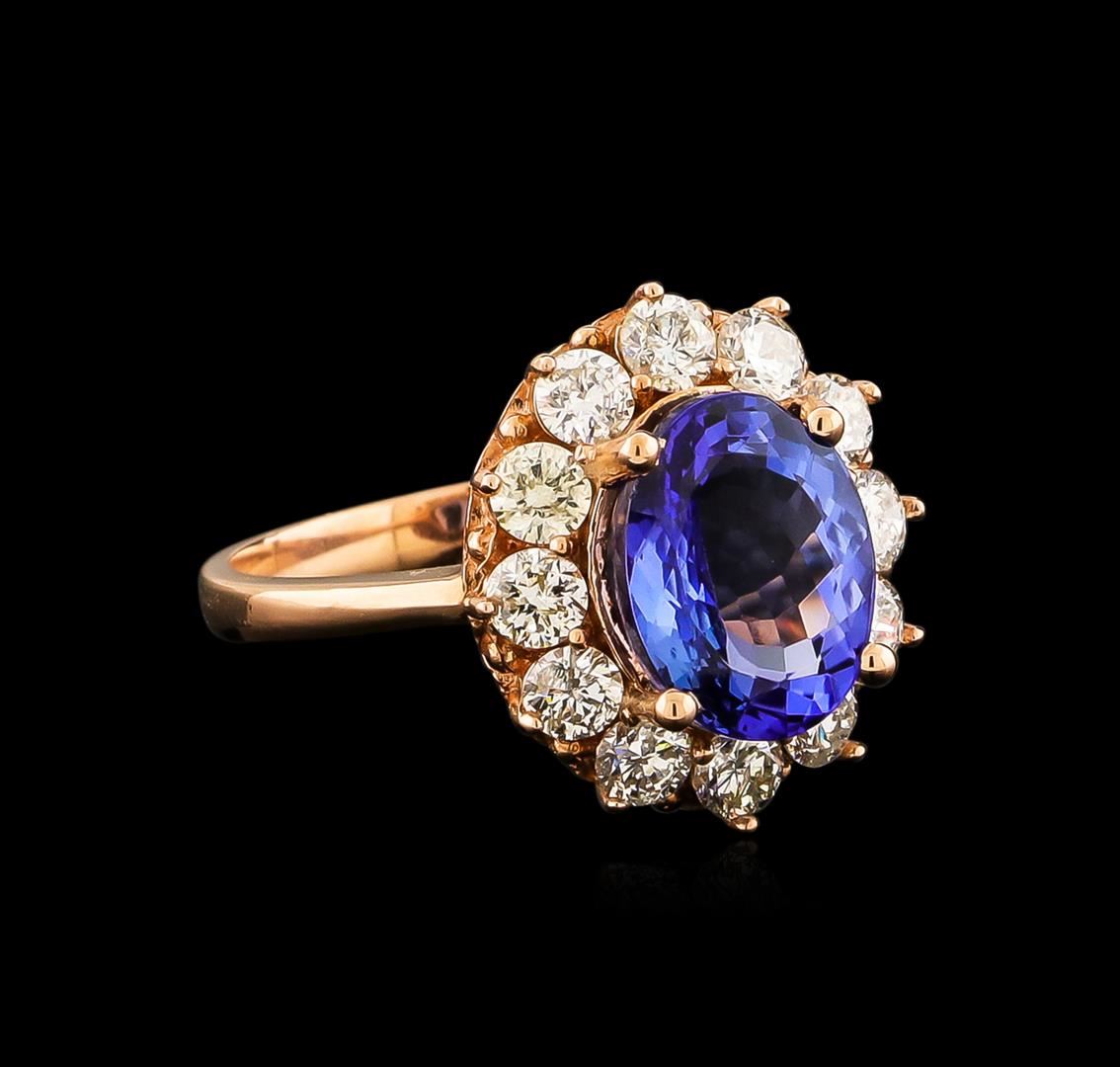 One electronically tested 14KT rose gold ladies combination cast & assembled ring with a bright polish finish. Condition is new. Identified with markings of "K14". Containing: One prong set oval modified brilliant cut natural tanzanite, measuring 10.70 x 8.76 x 5.20mm, approximate weight of 3.30ct., clarity is eye clean, type I, medium, moderately strong, bluish violet color, (GIA bV 5/4), cut is good. Twelve prong set round brilliant cut diamonds, measuring 2.90 - 2.90 x 1.74mm (depth est.) approximate total weight of 12 Stones = 1.07ct. Clarity: SI-2 to I-1. Color: J - K, Cut is Good. Colored gemstones are presumed to have been subjected to commonly used enhancement processes. All diamonds and colored gemstones are graded in the mounting, unless otherwise stated. Total Weight of Colored Stones 3.30ct. Total Weight of Diamonds 1.07ct. Total Weight of Ring 5.40 grams. GGL Appraised at $8,890.00.