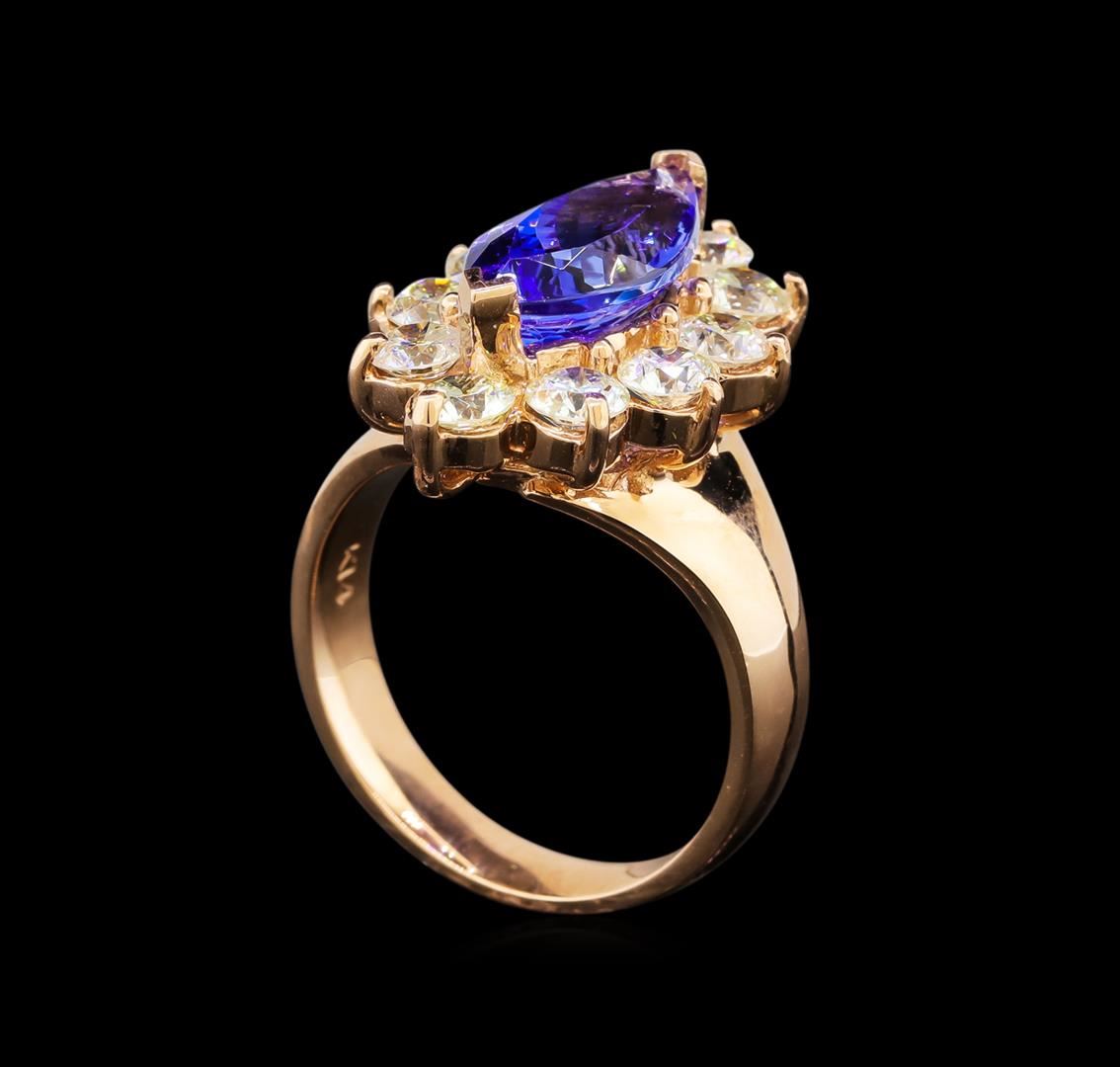 One electronically tested 14KT rose gold ladies cast tanzanite and diamond ring with a bright polish finish. Identified with markings of "K14". Condition is new. Containing: One prong set marquise modified brilliant cut natural tanzanite, measuring 14.00 x 6.50 x 6.00mm, approximate weight of 3.48ct., clarity is eye clean, type I, medium light, moderately strong, bluish violet color, (GIA bV 4/4), cut is good. Ten prong set round brilliant cut diamonds, measuring 3.50 - 3.50 x 2.10mm (depth est.) approximate total weight of 10 Stones = 1.57ct. Clarity: SI-2 to I-1. Color: K - L, Cut is Good. Colored gemstones are presumed to have been subjected to commonly used enhancement processes. All diamonds and colored gemstones are graded in the mounting, unless otherwise stated. Total Weight of Colored Stones 3.48ct. Total Weight of Diamonds 1.57ct. Total Weight of Ring 7.90 grams. GGL Appraised.