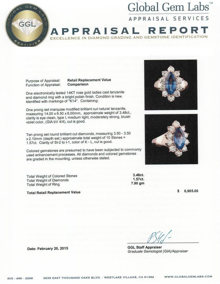 One electronically tested 14KT rose gold ladies cast tanzanite and diamond ring with a bright polish finish. Identified with markings of "K14". Condition is new. Containing: One prong set marquise modified brilliant cut natural tanzanite, measuring 14.00 x 6.50 x 6.00mm, approximate weight of 3.48ct., clarity is eye clean, type I, medium light, moderately strong, bluish violet color, (GIA bV 4/4), cut is good. Ten prong set round brilliant cut diamonds, measuring 3.50 - 3.50 x 2.10mm (depth est.) approximate total weight of 10 Stones = 1.57ct. Clarity: SI-2 to I-1. Color: K - L, Cut is Good. Colored gemstones are presumed to have been subjected to commonly used enhancement processes. All diamonds and colored gemstones are graded in the mounting, unless otherwise stated. Total Weight of Colored Stones 3.48ct. Total Weight of Diamonds 1.57ct. Total Weight of Ring 7.90 grams. GGL Appraised.
