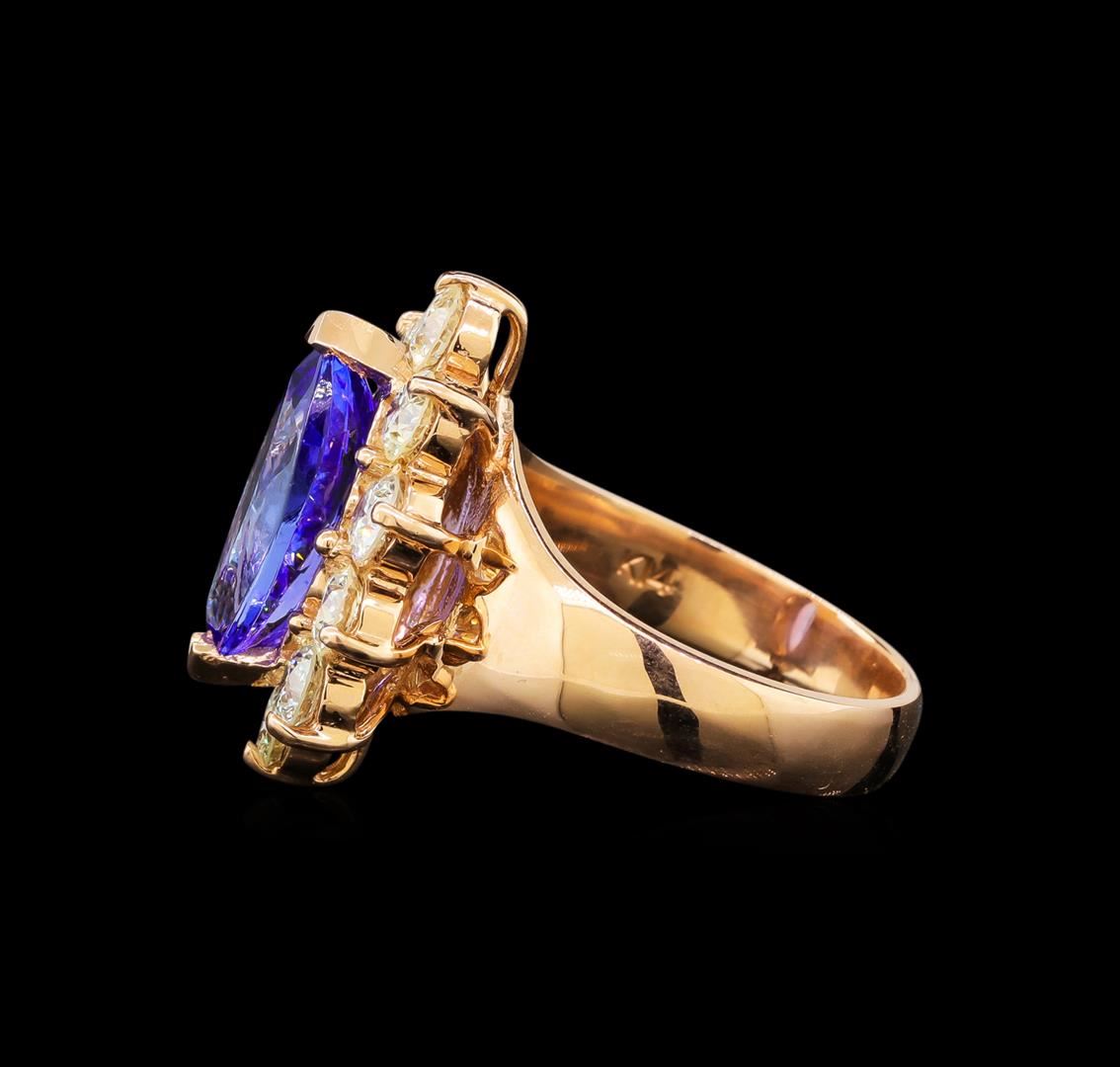 One electronically tested 14KT rose gold ladies cast tanzanite and diamond ring with a bright polish finish. Identified with markings of "K14". Condition is new. Containing: One prong set marquise modified brilliant cut natural tanzanite, measuring 14.00 x 6.50 x 6.00mm, approximate weight of 3.48ct., clarity is eye clean, type I, medium light, moderately strong, bluish violet color, (GIA bV 4/4), cut is good. Ten prong set round brilliant cut diamonds, measuring 3.50 - 3.50 x 2.10mm (depth est.) approximate total weight of 10 Stones = 1.57ct. Clarity: SI-2 to I-1. Color: K - L, Cut is Good. Colored gemstones are presumed to have been subjected to commonly used enhancement processes. All diamonds and colored gemstones are graded in the mounting, unless otherwise stated. Total Weight of Colored Stones 3.48ct. Total Weight of Diamonds 1.57ct. Total Weight of Ring 7.90 grams. GGL Appraised.