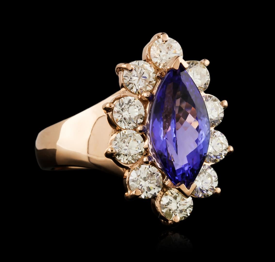 One electronically tested 14KT rose gold ladies cast tanzanite and diamond ring with a bright polish finish. Identified with markings of "K14". Condition is new. Containing: One prong set marquise modified brilliant cut natural tanzanite, measuring 14.00 x 6.50 x 6.00mm, approximate weight of 3.48ct., clarity is eye clean, type I, medium light, moderately strong, bluish violet color, (GIA bV 4/4), cut is good. Ten prong set round brilliant cut diamonds, measuring 3.50 - 3.50 x 2.10mm (depth est.) approximate total weight of 10 Stones = 1.57ct. Clarity: SI-2 to I-1. Color: K - L, Cut is Good. Colored gemstones are presumed to have been subjected to commonly used enhancement processes. All diamonds and colored gemstones are graded in the mounting, unless otherwise stated. Total Weight of Colored Stones 3.48ct. Total Weight of Diamonds 1.57ct. Total Weight of Ring 7.90 grams. GGL Appraised at $6,905.00.