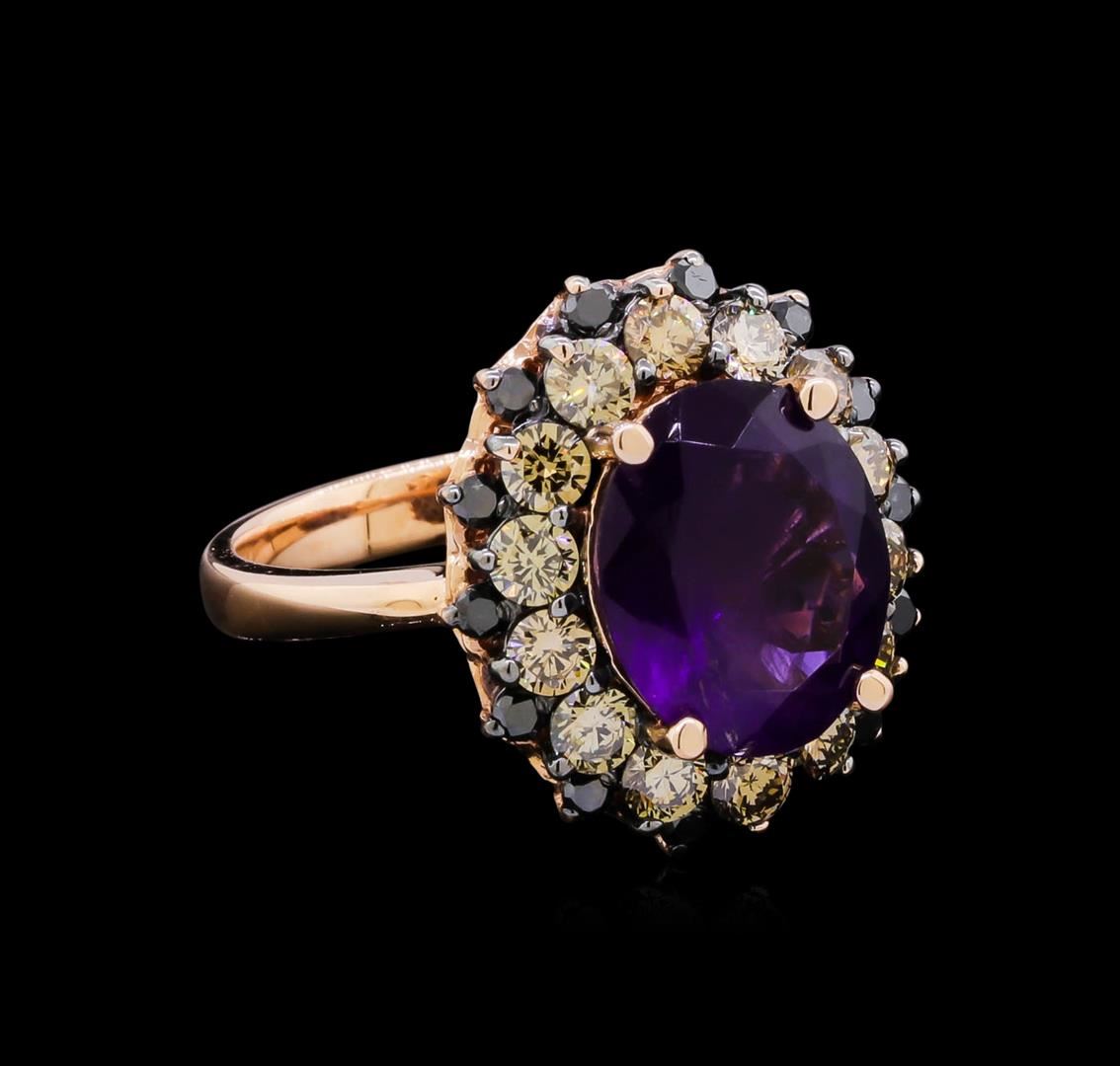 One electronically tested 14KT rose gold ladies cast amethyst and diamond ring. Condition is new, good workmanship. The featured amethyst is set within a tiered diamond bezel, completed by a two and one-half millimeter wide band. Bright and anodized finish. Identified with markings of "14K". Containing: One prong set oval mixed cut natural amethyst, measuring 11.50 x 9.50 x 5.90mm, 5% bulge factor, approximate weight of 3.68ct., clarity is heavily included, type II, medium dark, very slightly grayish, reddish purple color, (GIA rP 6/3), cut is good. Transmitting light with a minimum of distortion, transparent. Naturally occurring internal & external characteristics are present. Graded in the setting. Fourteen prong set round brilliant cut diamonds, measuring 2.80 - 2.70 x 1.65mm (depth est.) approximate total weight of 14 Stones = 1.20ct. Graded in the setting. Clarity SI-1 to I-1. Color Fancy Light Brown Fourteen prong set round brilliant cut diamonds, measuring 1.80 - 1.70 x 1.05mm (depth est.) approximate total weight of 14 Stones = 0.33ct. Indications of multiple laboratory enhancements. Graded in the setting. Clarity Declasse. Color Fancy Black; Irradiated. Total Weight of Colored Stones 3.68ct. Total Weight of Diamonds 1.53ct. Total Weight of Ring 6.89gm. AIG Appraised at $4,420.00.