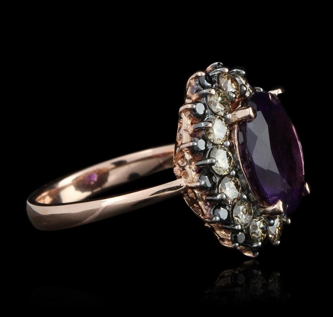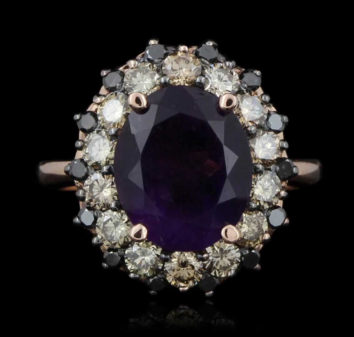 One electronically tested 14KT rose gold ladies cast amethyst and diamond ring. Condition is new, good workmanship. The featured amethyst is set within a tiered diamond bezel, completed by a two and one-half millimeter wide band. Bright and anodized finish. Identified with markings of "14K". Containing: One prong set oval mixed cut natural amethyst, measuring 11.50 x 9.50 x 5.90mm, 5% bulge factor, approximate weight of 3.68ct., clarity is heavily included, type II, medium dark, very slightly grayish, reddish purple color, (GIA rP 6/3), cut is good. Transmitting light with a minimum of distortion, transparent. Naturally occurring internal & external characteristics are present. Graded in the setting. Fourteen prong set round brilliant cut diamonds, measuring 2.80 - 2.70 x 1.65mm (depth est.) approximate total weight of 14 Stones = 1.20ct. Graded in the setting. Clarity SI-1 to I-1. Color Fancy Light Brown Fourteen prong set round brilliant cut diamonds, measuring 1.80 - 1.70 x 1.05mm (depth est.) approximate total weight of 14 Stones = 0.33ct. Indications of multiple laboratory enhancements. Graded in the setting. Clarity Declasse. Color Fancy Black; Irradiated. Total Weight of Colored Stones 3.68ct. Total Weight of Diamonds 1.53ct. Total Weight of Ring 6.89gm. AIG Appraised at $4,420.00.