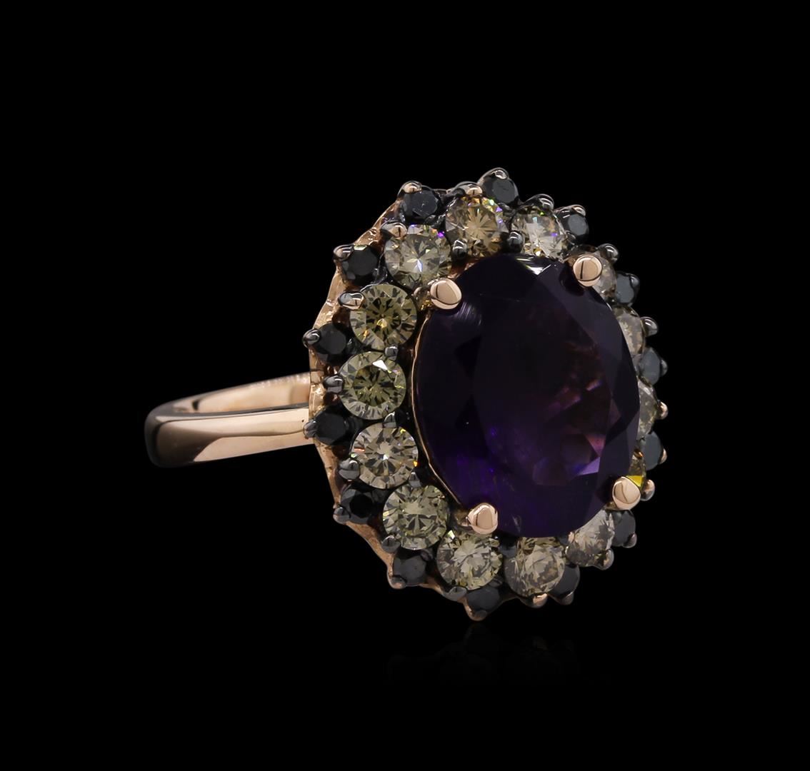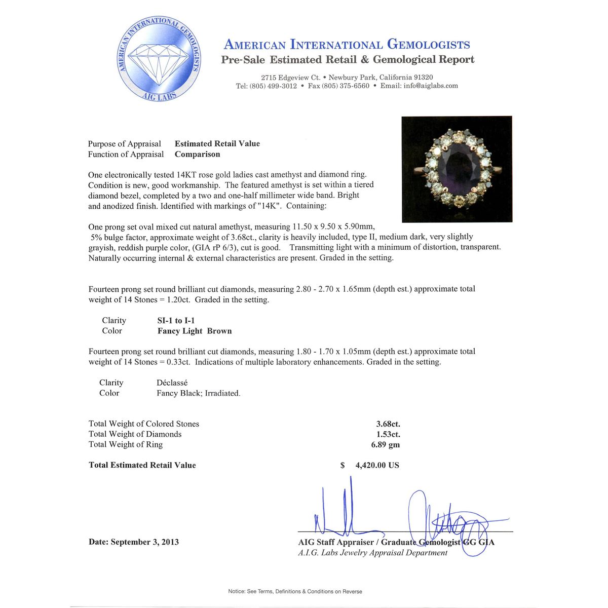 One electronically tested 14KT rose gold ladies cast amethyst and diamond ring. Condition is new, good workmanship. The featured amethyst is set within a tiered diamond bezel, completed by a two and one-half millimeter wide band. Bright and anodized finish. Identified with markings of "14K". Containing: One prong set oval mixed cut natural amethyst, measuring 11.50 x 9.50 x 5.90mm, 5% bulge factor, approximate weight of 3.68ct., clarity is heavily included, type II, medium dark, very slightly grayish, reddish purple color, (GIA rP 6/3), cut is good. Transmitting light with a minimum of distortion, transparent. Naturally occurring internal & external characteristics are present. Graded in the setting. Fourteen prong set round brilliant cut diamonds, measuring 2.80 - 2.70 x 1.65mm (depth est.) approximate total weight of 14 Stones = 1.20ct. Graded in the setting. Clarity SI-1 to I-1. Color Fancy Light Brown Fourteen prong set round brilliant cut diamonds, measuring 1.80 - 1.70 x 1.05mm (depth est.) approximate total weight of 14 Stones = 0.33ct. Indications of multiple laboratory enhancements. Graded in the setting. Clarity Declasse. Color Fancy Black; Irradiated. Total Weight of Colored Stones 3.68ct. Total Weight of Diamonds 1.53ct. Total Weight of Ring 6.89gm. AIG Appraised at $4,420.00.