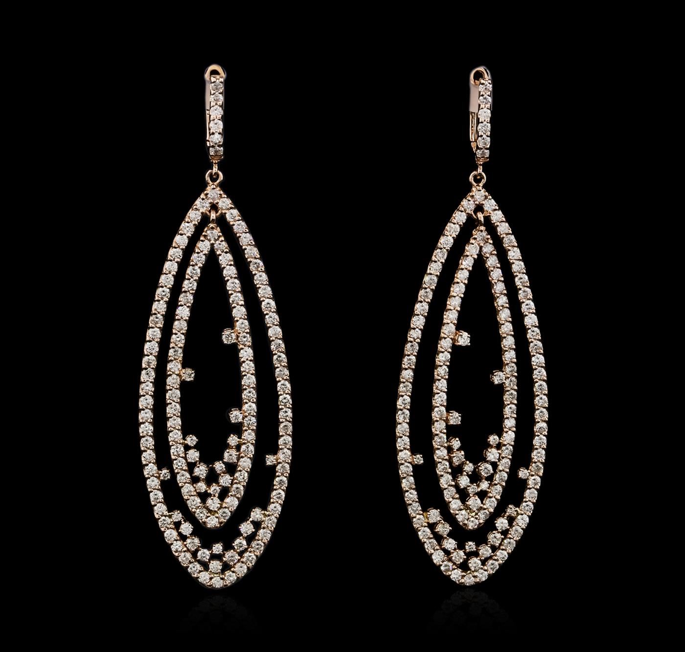 One pair electronically tested 14KT rose gold ladies cast diamond earrings with hinged clip backs with a bright polish finish. Identified with markings of "K14". Condition is new. Containing: Two Hundred Seventy-Six prong set round brilliant cut diamonds, measuring 1.70 - 1.40 x 0.93mm (depth est.) approximate total weight of 276 Stones = 3.75ct. Clarity: I-1 to I-2. Color: J - K, Cut is Good. All diamonds are graded in the mounting, unless otherwise stated. Total Weight of Diamonds 3.75ct. Total Weight of Earrings 16.80 grams. GGL Appraised at $9,700.00.