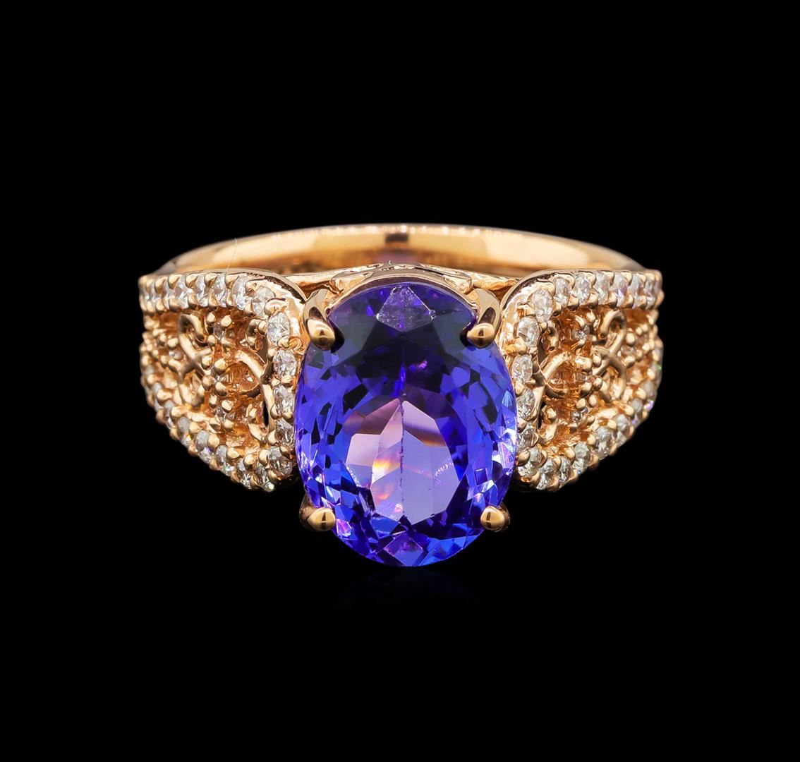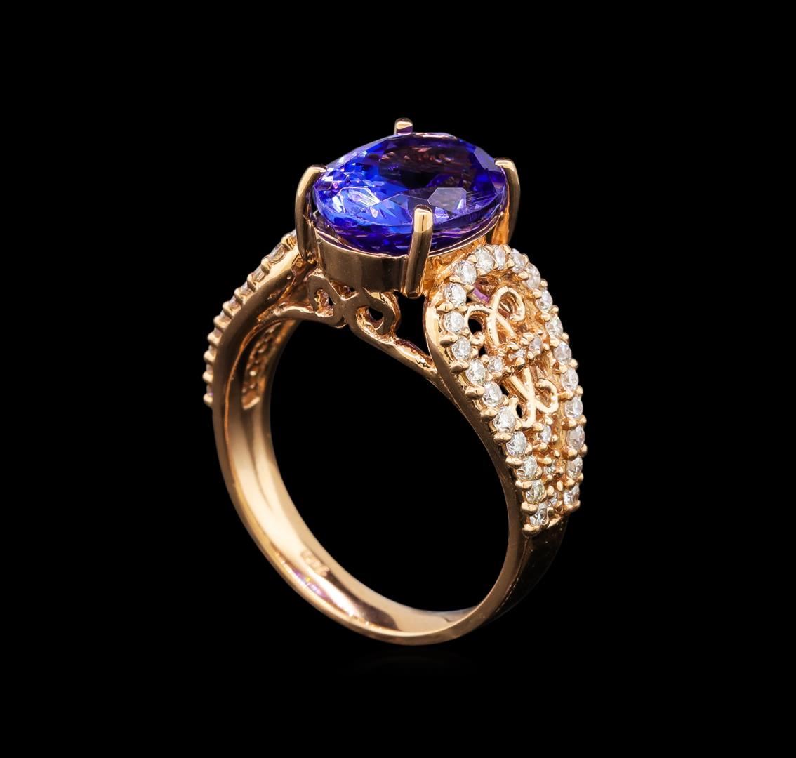 One electronically tested 14KT rose gold ladies cast tanzanite and diamond ring with a bright and brushed finish. Identified with markings of "14K". Condition is new. Containing: One prong set oval modified brilliant cut natural tanzanite, measuring 11.30 x 8.60 x 5.59mm, approximate weight of 3.82ct., clarity is eye clean, type I, medium light, very slightly grayish, violet color, (GIA V 4/3), cut is good. Fifty-Six prong set round brilliant cut diamonds, measuring 1.50 - 1.20 x 0.81mm (depth est.) approximate total weight of 56 Stones = 0.50ct. Clarity: SI-2 to I-2. Color: I - J. Colored gemstones are presumed to have been subjected to commonly used enhancement processes. All diamonds and colored gemstones are graded in the mounting, unless otherwise stated. Total Weight of Colored Stones 3.82ct. Total Weight of Diamonds 0.50ct. Total Weight of Ring 5.90 grams. GGL Appraised at $5,200.00.