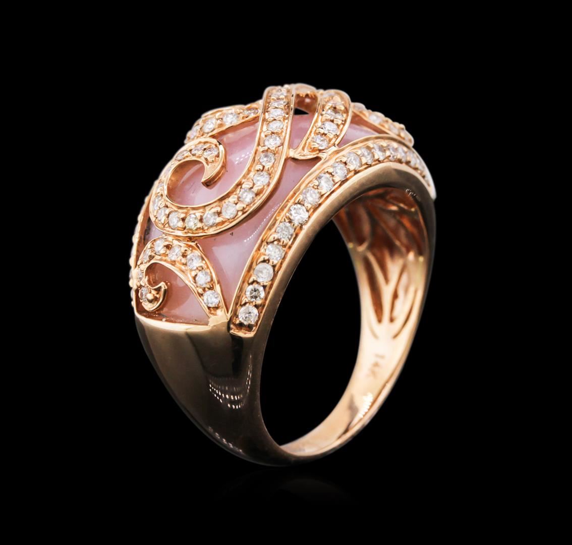 One ring featuring: 14KT rose gold weighing 5.25 grams containing one pink opal with a total weight of 3.85ct and 91 round diamonds with a total weight of 0.57ct.