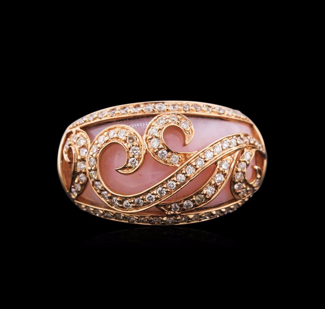 One ring featuring: 14KT rose gold weighing 5.25 grams containing one pink opal with a total weight of 3.85ct and 91 round diamonds with a total weight of 0.57ct.