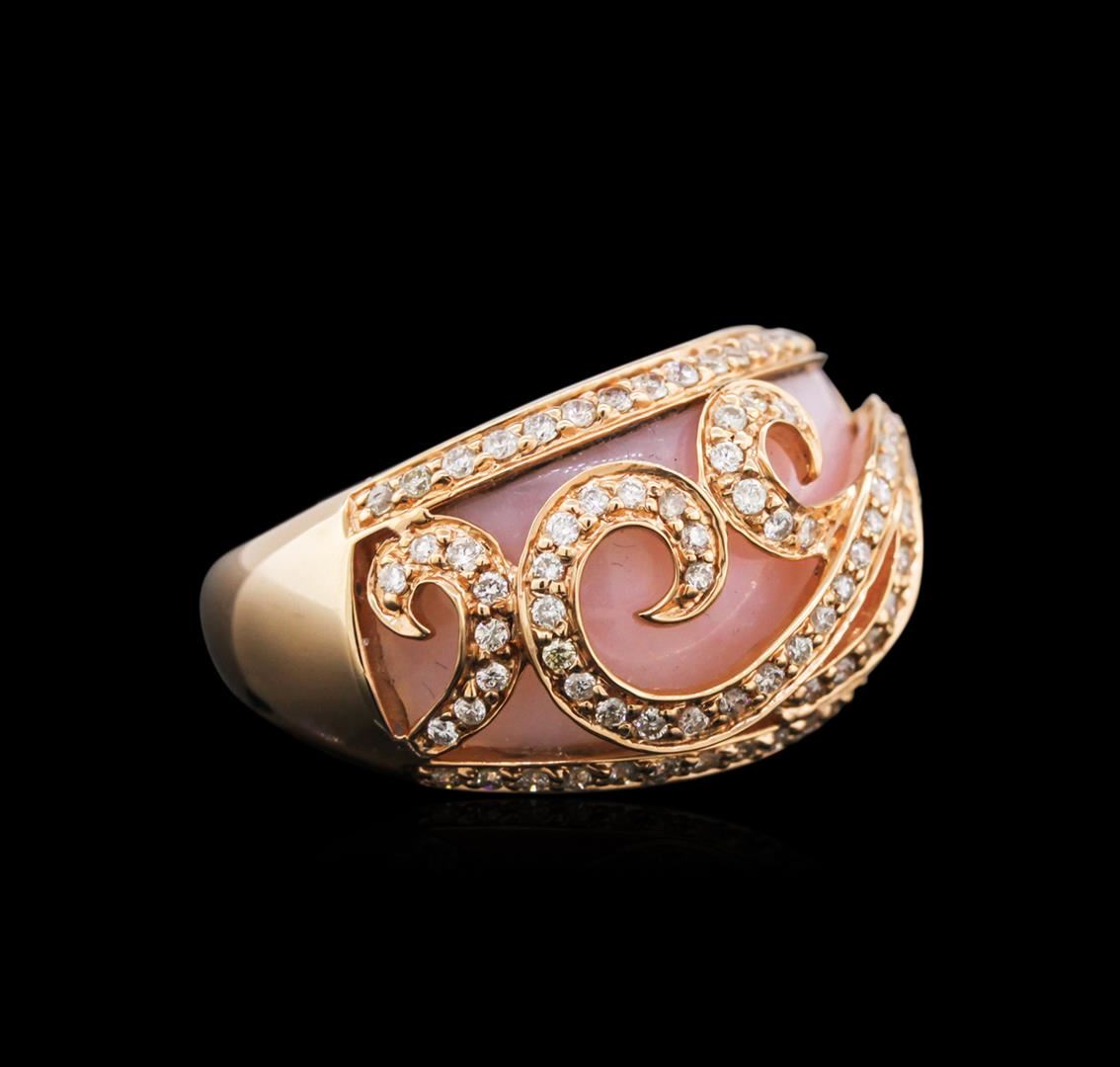 One ring featuring: 14KT rose gold weighing 5.25 grams containing one pink opal with a total weight of 3.85ct and 91 round diamonds with a total weight of 0.57ct.