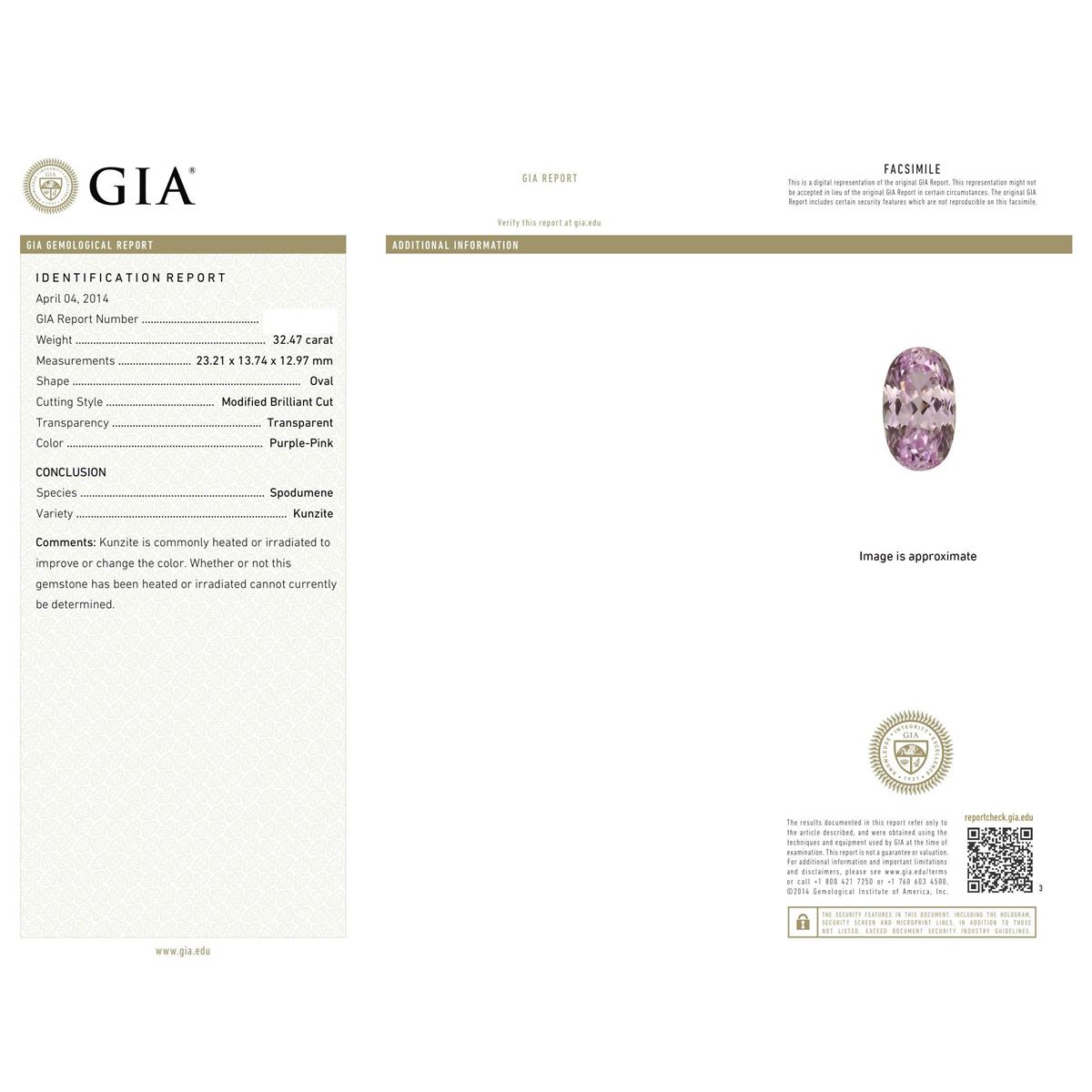 One electronically tested 14KT rose gold Ladies combination cast & assembled pendant & chain 16.8 inch long, medium with a hidden box clasp with a bright polish finish. Condition is new. Identified with markings of "14K". Containing: One prong set oval modified brilliant cut natural kunzite, measuring 23.21 x 13.74 x 12.97mm, exact weight 32.47ct., clarity is eye clean, type I, light, very slightly grayish, purple color, (GIA P 3/3), cut is very good. GIA Report: 2161000171. Eighty prong set round brilliant cut diamonds, measuring 2.50 - 1.90 x 1.32mm (depth est.) approximate. Total Weight of 80 Stones = 2.20ct. . Clarity: I-1 to I-2. Color: J - K, Cut is Good. One Hundred Forty-Seven prong set round brilliant cut diamonds, measuring 1.10 - 1.10 x 0.66mm (depth est.) approximate. Total Weight of 147 Stones = 0.71ct. . Clarity: I-1 to I-2. Color: I - J, Cut is Good. Total Weight of Colored Stones 32.47ct. Total Weight of Diamonds 2.91ct. Total Weight of Pendant & Chain 35.80 grams. GGL Appraised at $31,700.00.