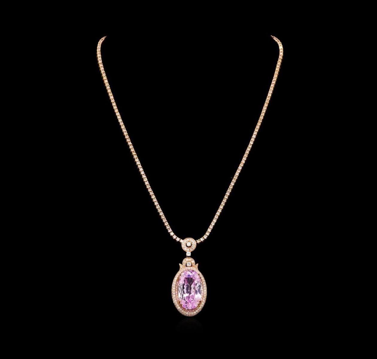 One electronically tested 14KT rose gold Ladies combination cast & assembled pendant & chain 16.8 inch long, medium with a hidden box clasp with a bright polish finish. Condition is new. Identified with markings of "14K". Containing: One prong set oval modified brilliant cut natural kunzite, measuring 23.21 x 13.74 x 12.97mm, exact weight 32.47ct., clarity is eye clean, type I, light, very slightly grayish, purple color, (GIA P 3/3), cut is very good. GIA Report: 2161000171. Eighty prong set round brilliant cut diamonds, measuring 2.50 - 1.90 x 1.32mm (depth est.) approximate. Total Weight of 80 Stones = 2.20ct. . Clarity: I-1 to I-2. Color: J - K, Cut is Good. One Hundred Forty-Seven prong set round brilliant cut diamonds, measuring 1.10 - 1.10 x 0.66mm (depth est.) approximate. Total Weight of 147 Stones = 0.71ct. . Clarity: I-1 to I-2. Color: I - J, Cut is Good. Total Weight of Colored Stones 32.47ct. Total Weight of Diamonds 2.91ct. Total Weight of Pendant & Chain 35.80 grams. GGL Appraised.