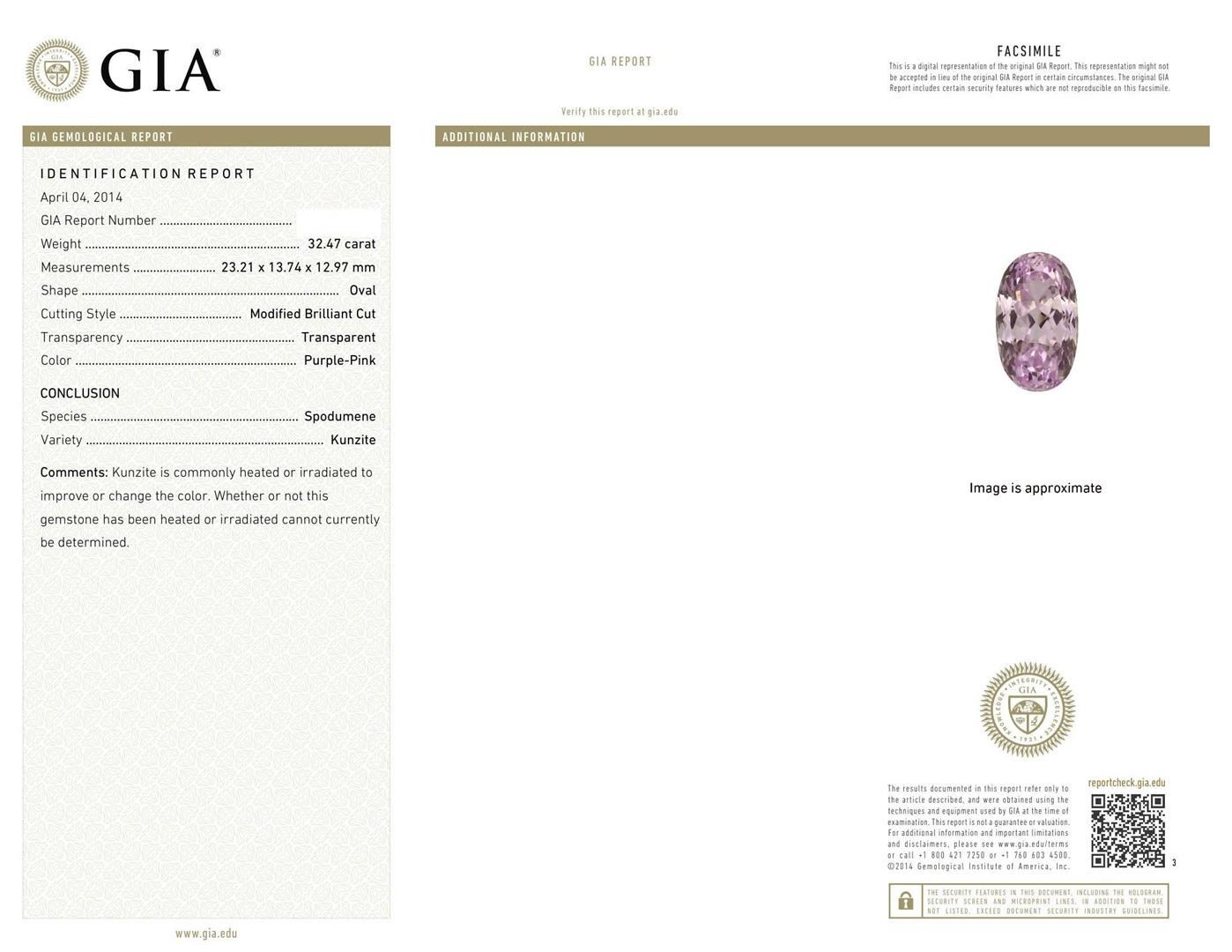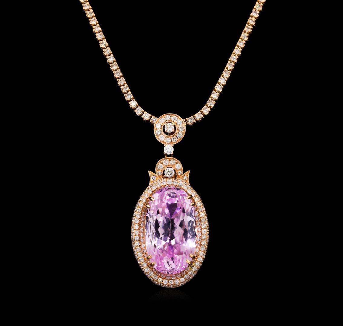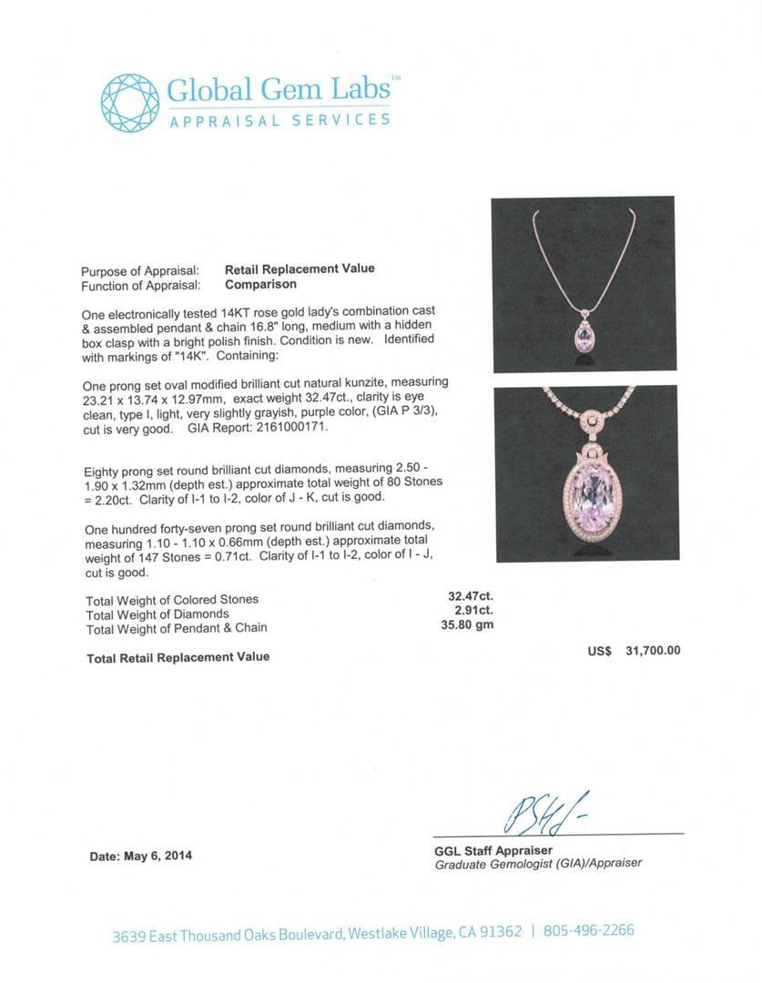 One electronically tested 14KT rose gold Ladies combination cast & assembled pendant & chain 16.8 inch long, medium with a hidden box clasp with a bright polish finish. Condition is new. Identified with markings of "14K". Containing: One prong set oval modified brilliant cut natural kunzite, measuring 23.21 x 13.74 x 12.97mm, exact weight 32.47ct., clarity is eye clean, type I, light, very slightly grayish, purple color, (GIA P 3/3), cut is very good. GIA Report: 2161000171. Eighty prong set round brilliant cut diamonds, measuring 2.50 - 1.90 x 1.32mm (depth est.) approximate. Total Weight of 80 Stones = 2.20ct. . Clarity: I-1 to I-2. Color: J - K, Cut is Good. One Hundred Forty-Seven prong set round brilliant cut diamonds, measuring 1.10 - 1.10 x 0.66mm (depth est.) approximate. Total Weight of 147 Stones = 0.71ct. . Clarity: I-1 to I-2. Color: I - J, Cut is Good. Total Weight of Colored Stones 32.47ct. Total Weight of Diamonds 2.91ct. Total Weight of Pendant & Chain 35.80 grams. GGL Appraised.