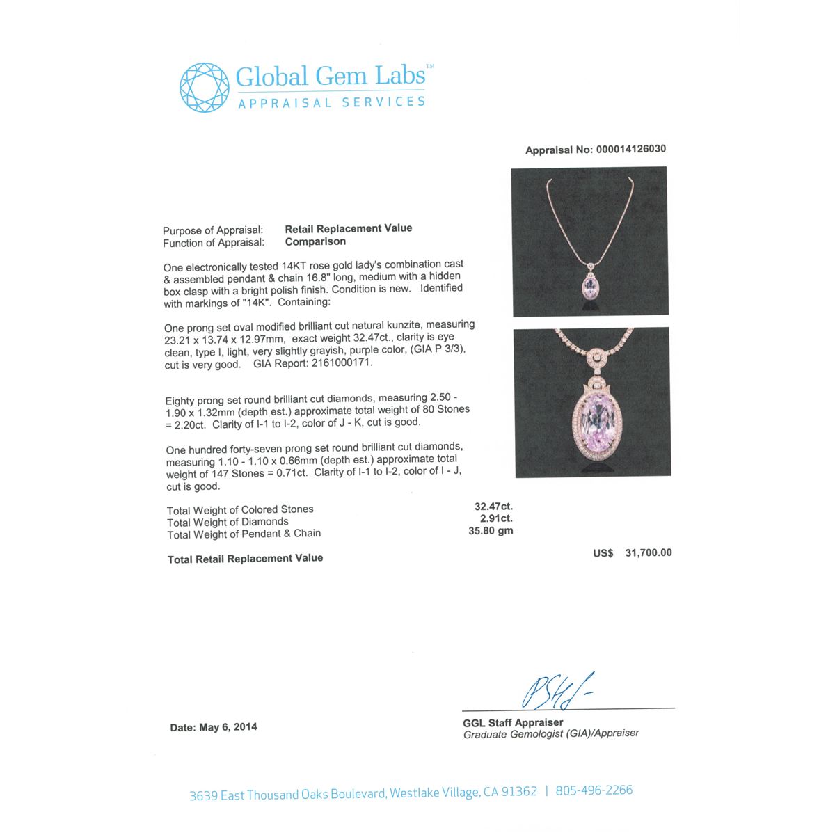 One electronically tested 14KT rose gold Ladies combination cast & assembled pendant & chain 16.8 inch long, medium with a hidden box clasp with a bright polish finish. Condition is new. Identified with markings of "14K". Containing: One prong set oval modified brilliant cut natural kunzite, measuring 23.21 x 13.74 x 12.97mm, exact weight 32.47ct., clarity is eye clean, type I, light, very slightly grayish, purple color, (GIA P 3/3), cut is very good. GIA Report: 2161000171. Eighty prong set round brilliant cut diamonds, measuring 2.50 - 1.90 x 1.32mm (depth est.) approximate. Total Weight of 80 Stones = 2.20ct. . Clarity: I-1 to I-2. Color: J - K, Cut is Good. One Hundred Forty-Seven prong set round brilliant cut diamonds, measuring 1.10 - 1.10 x 0.66mm (depth est.) approximate. Total Weight of 147 Stones = 0.71ct. . Clarity: I-1 to I-2. Color: I - J, Cut is Good. Total Weight of Colored Stones 32.47ct. Total Weight of Diamonds 2.91ct. Total Weight of Pendant & Chain 35.80 grams. GGL Appraised at $31,700.00.