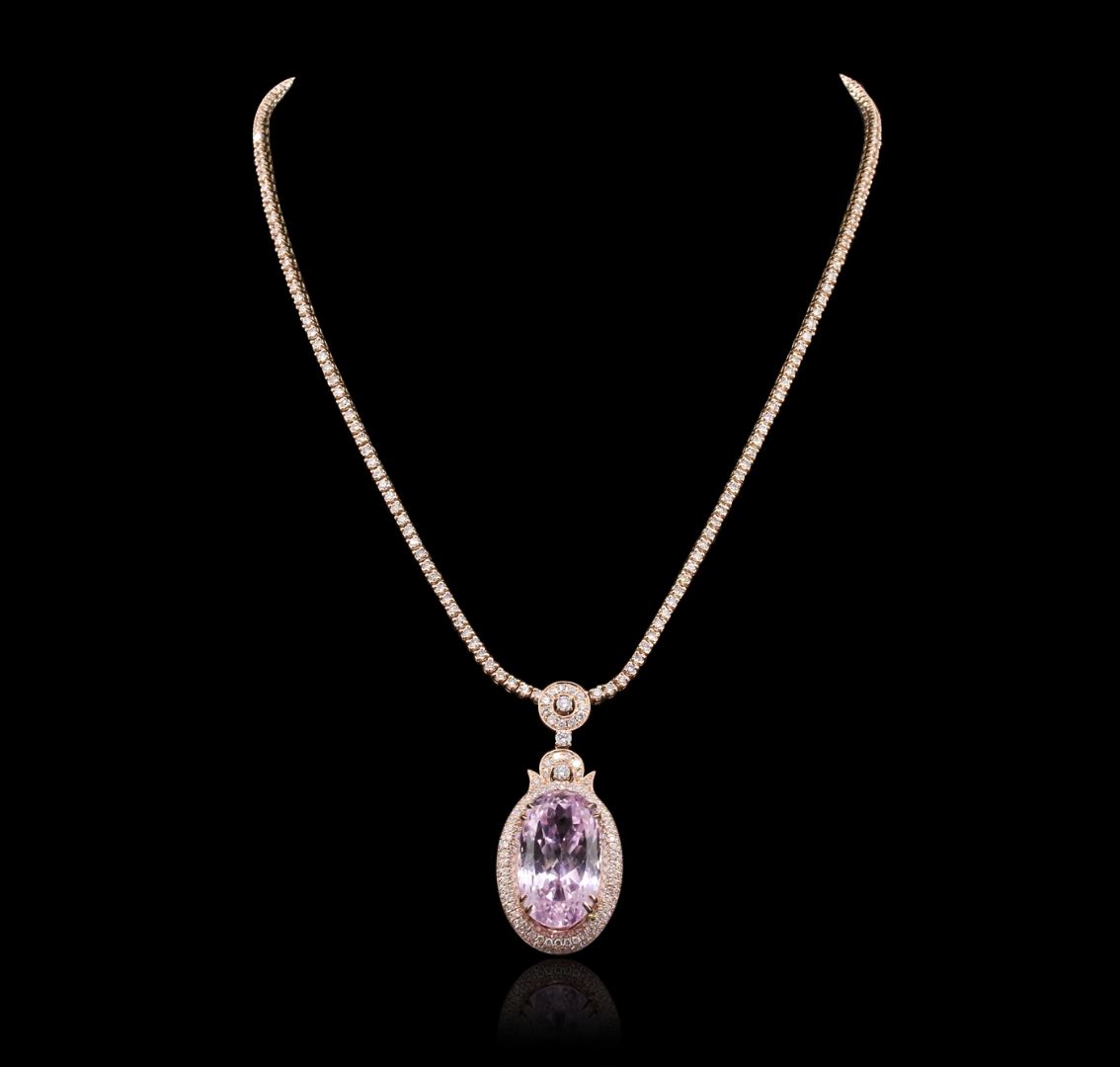 One electronically tested 14KT rose gold Ladies combination cast & assembled pendant & chain 16.8 inch long, medium with a hidden box clasp with a bright polish finish. Condition is new. Identified with markings of "14K". Containing: One prong set oval modified brilliant cut natural kunzite, measuring 23.21 x 13.74 x 12.97mm, exact weight 32.47ct., clarity is eye clean, type I, light, very slightly grayish, purple color, (GIA P 3/3), cut is very good. GIA Report: 2161000171. Eighty prong set round brilliant cut diamonds, measuring 2.50 - 1.90 x 1.32mm (depth est.) approximate. Total Weight of 80 Stones = 2.20ct. . Clarity: I-1 to I-2. Color: J - K, Cut is Good. One Hundred Forty-Seven prong set round brilliant cut diamonds, measuring 1.10 - 1.10 x 0.66mm (depth est.) approximate. Total Weight of 147 Stones = 0.71ct. . Clarity: I-1 to I-2. Color: I - J, Cut is Good. Total Weight of Colored Stones 32.47ct. Total Weight of Diamonds 2.91ct. Total Weight of Pendant & Chain 35.80 grams. GGL Appraised at $31,700.00.