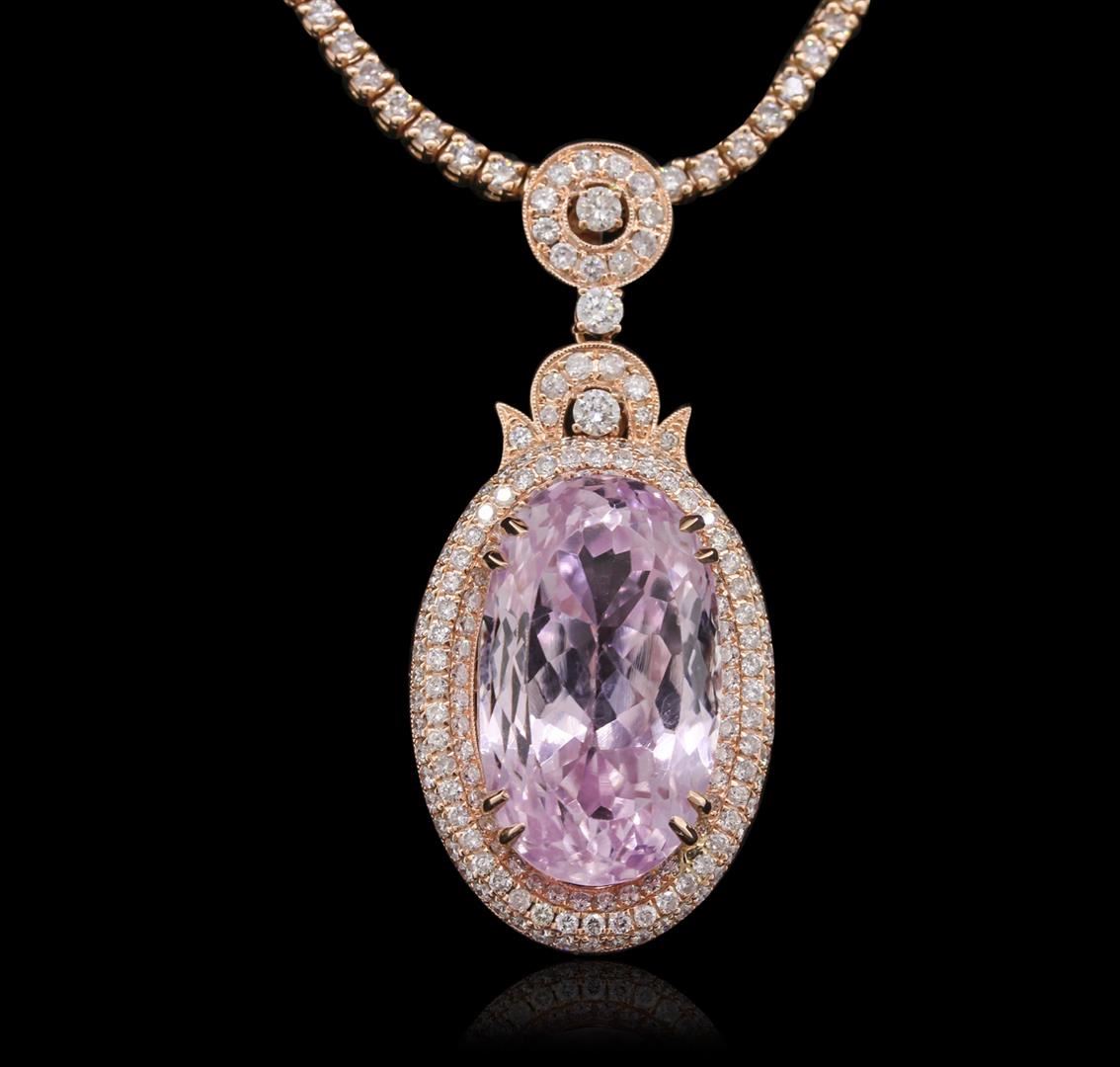 One electronically tested 14KT rose gold Ladies combination cast & assembled pendant & chain 16.8 inch long, medium with a hidden box clasp with a bright polish finish. Condition is new. Identified with markings of "14K". Containing: One prong set oval modified brilliant cut natural kunzite, measuring 23.21 x 13.74 x 12.97mm, exact weight 32.47ct., clarity is eye clean, type I, light, very slightly grayish, purple color, (GIA P 3/3), cut is very good. GIA Report: 2161000171. Eighty prong set round brilliant cut diamonds, measuring 2.50 - 1.90 x 1.32mm (depth est.) approximate. Total Weight of 80 Stones = 2.20ct. . Clarity: I-1 to I-2. Color: J - K, Cut is Good. One Hundred Forty-Seven prong set round brilliant cut diamonds, measuring 1.10 - 1.10 x 0.66mm (depth est.) approximate. Total Weight of 147 Stones = 0.71ct. . Clarity: I-1 to I-2. Color: I - J, Cut is Good. Total Weight of Colored Stones 32.47ct. Total Weight of Diamonds 2.91ct. Total Weight of Pendant & Chain 35.80 grams. GGL Appraised at $31,700.00.