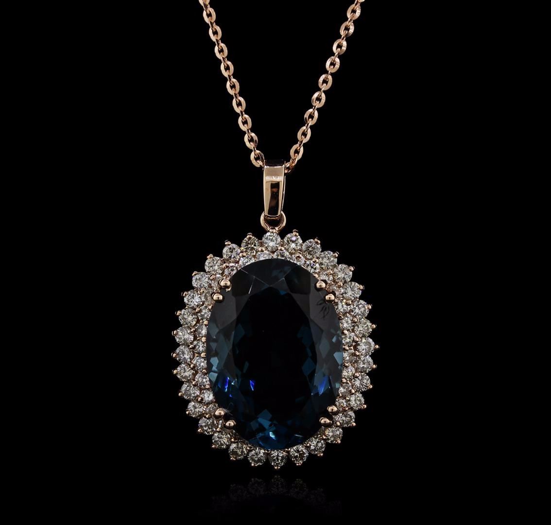 One electronically tested 14KT rose gold ladies cast topaz and diamond pendant & chain 18.0" long, small oval link with a lobster claw clasp with a bright polish finish. Identified with markings of "14K". Condition is new. Containing: One prong set oval modified brilliant cut natural blue topaz, measuring 25.06 x 17.86 x 10.56mm, exact weight 35.04ct., clarity is eye clean, type I, medium, very slightly grayish, greenish blue color, (GIA gB 5/3), cut is good. Sixty-Four prong set round brilliant cut diamonds, measuring 2.40 - 2.00 x 1.32mm (depth est.) approximate total weight of 64 Stones = 2.49ct. Clarity: SI-1 to I-1. Color: L - M, Cut is Good. Colored gemstones are presumed to have been subjected to commonly used enhancement processes. Diamonds and colored gemstones are graded in the mounting, unless otherwise stated. Total Weight of Colored Stones 35.04ct. Total Weight of Diamonds 2.49ct. Total Weight of Pendant & Chain 21.10 grams. GGL Appraised at $5,000.00.